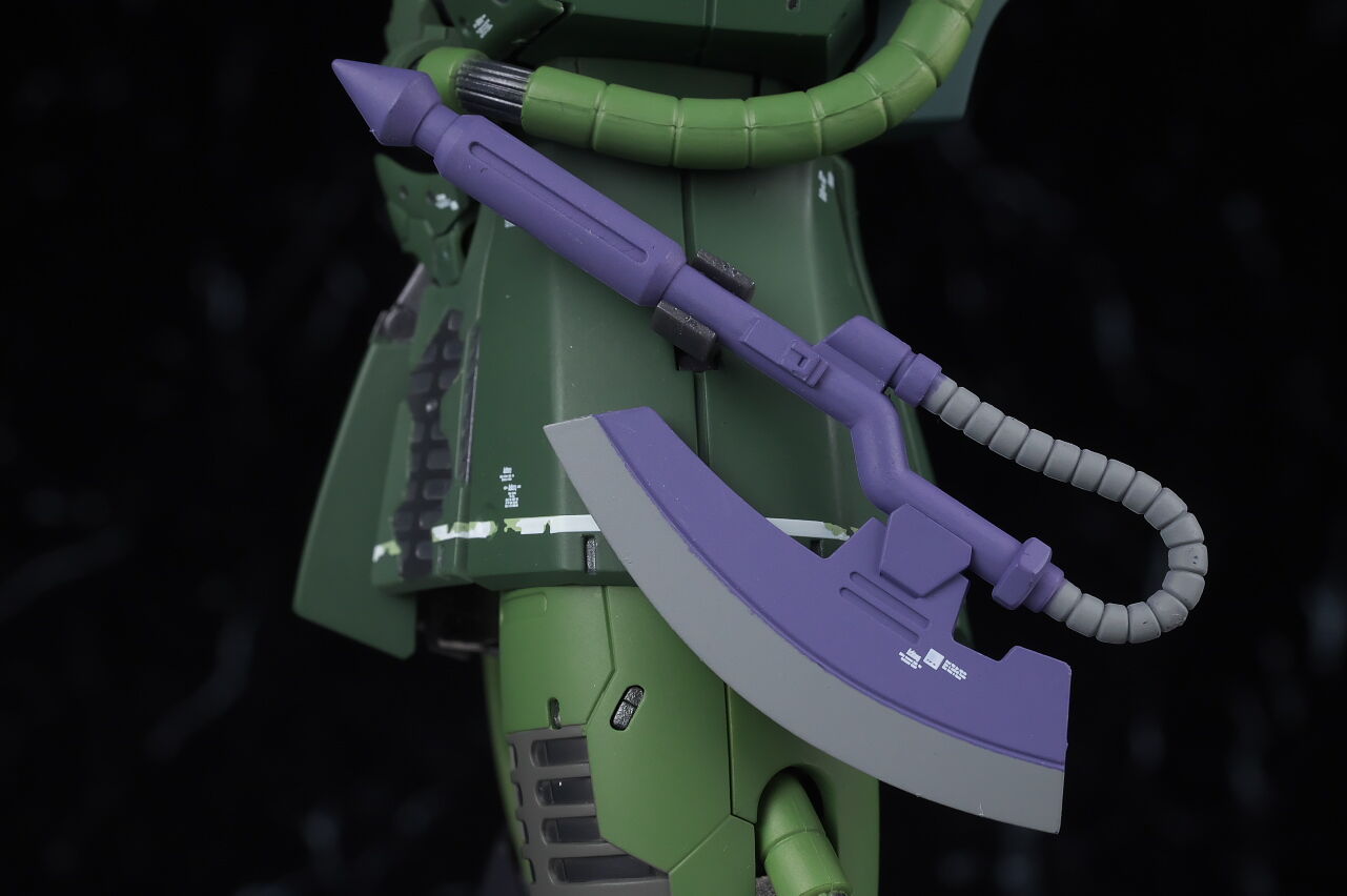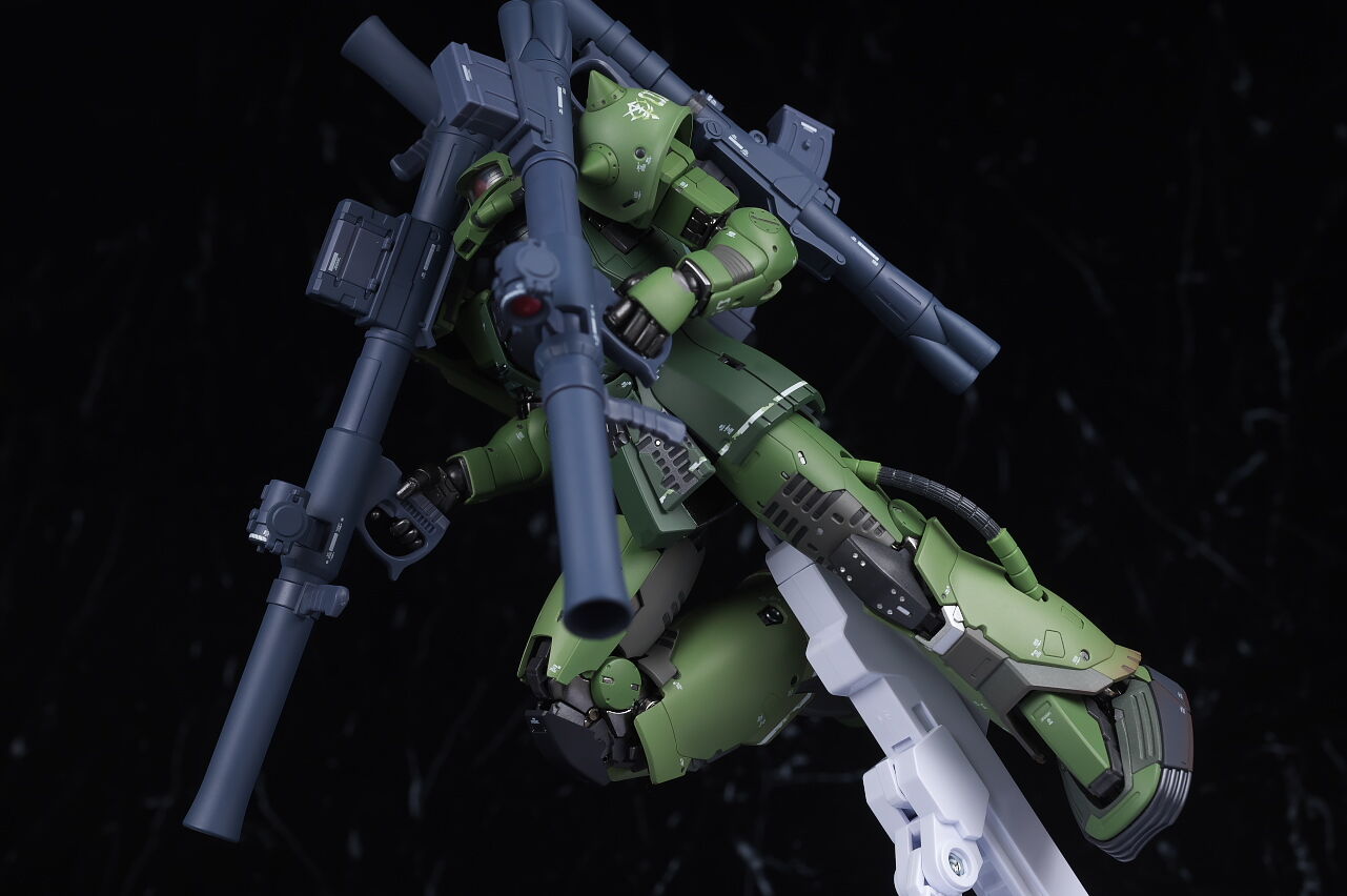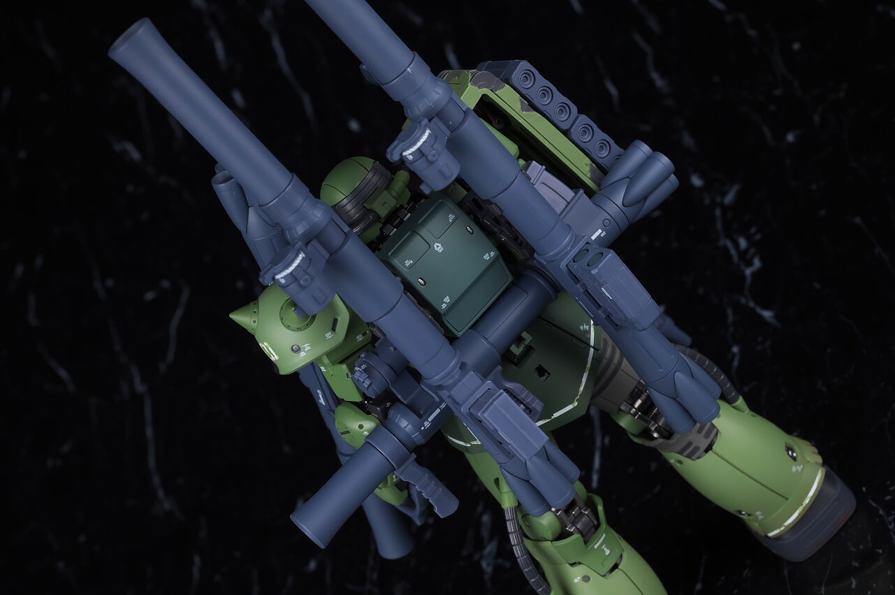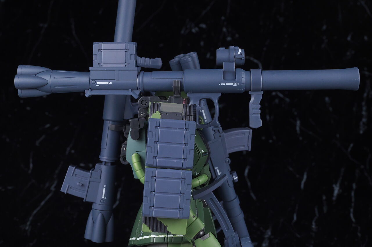 可動はノーマルのザクと変わらず全体的に良好で、劇中使っていないマシンガンやバズーカなどの武器も大量に付いてるので遊びの面での不満も無かったです。