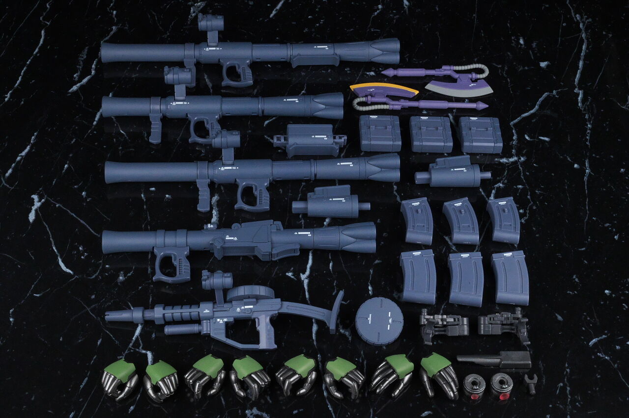 フォアグリップは可動、スコープカバーは開閉可能。ギミックはどれも共通で、バズーカA、B、Cにはマガジン無しの交換用砲身パーツも付属。