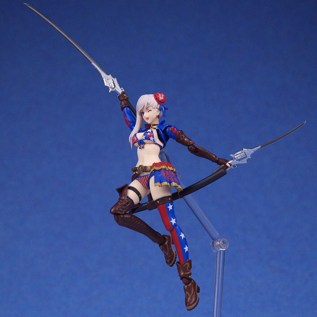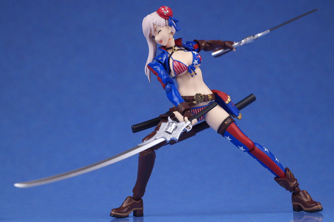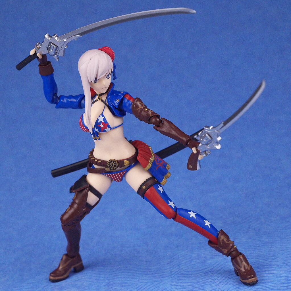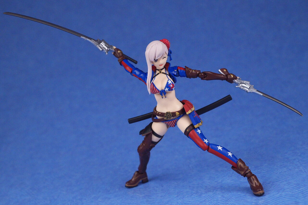 可動も股関節周りだけ少し窮屈でしたが、他は良好で、イラストやゲーム中のモーションなども大体は再現出来、武器も珍しい銃剣の二刀流で新鮮味もあって遊びの面でも大きな不満は無かったです。