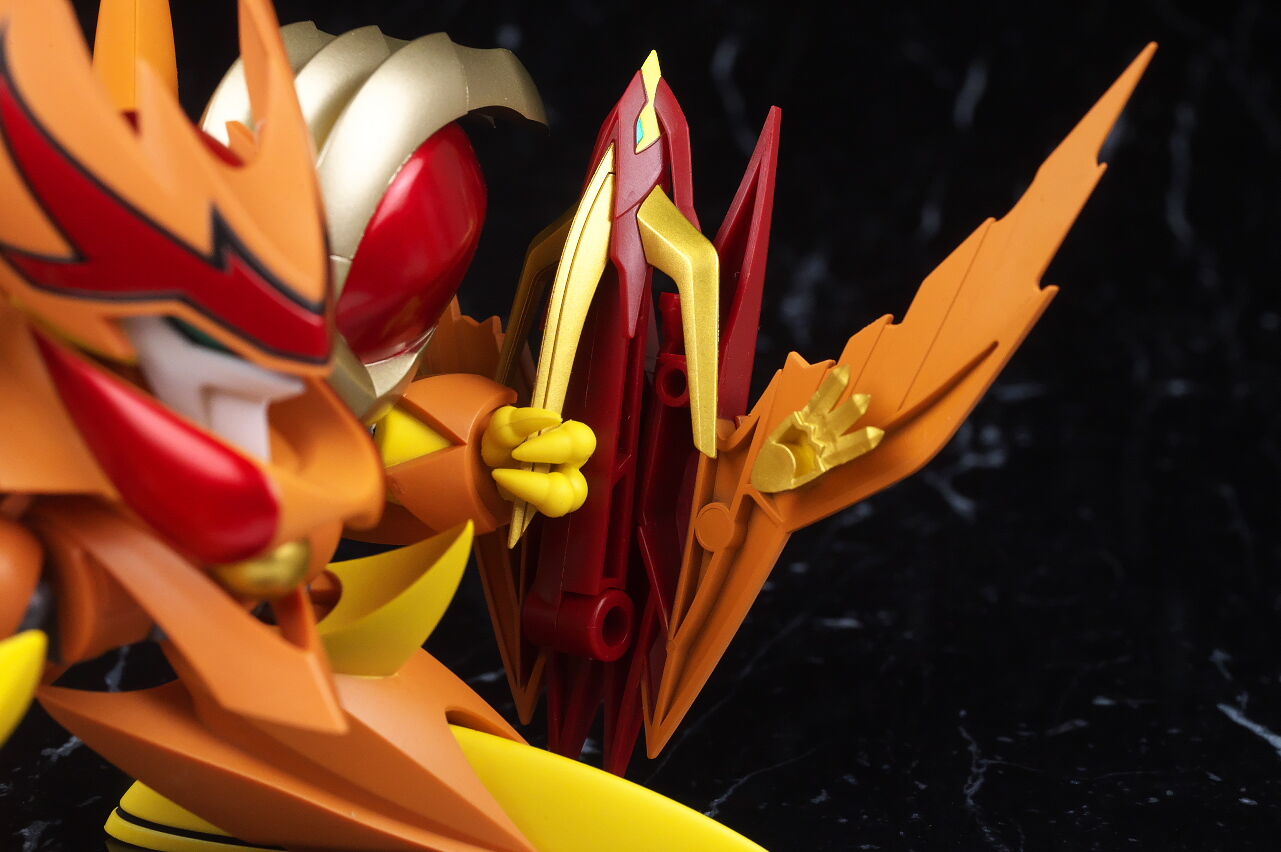 可動もこれまでと同じくそこまで動くわけでは無いですが、剣の両手持ちなどは可能で必殺技はきっちり再現出来、盾、剣、翼を合体させる鳳凰炎龍拳も再現出来るなどギミック面も凝ってて遊びの面でも特に不満は無かったです。