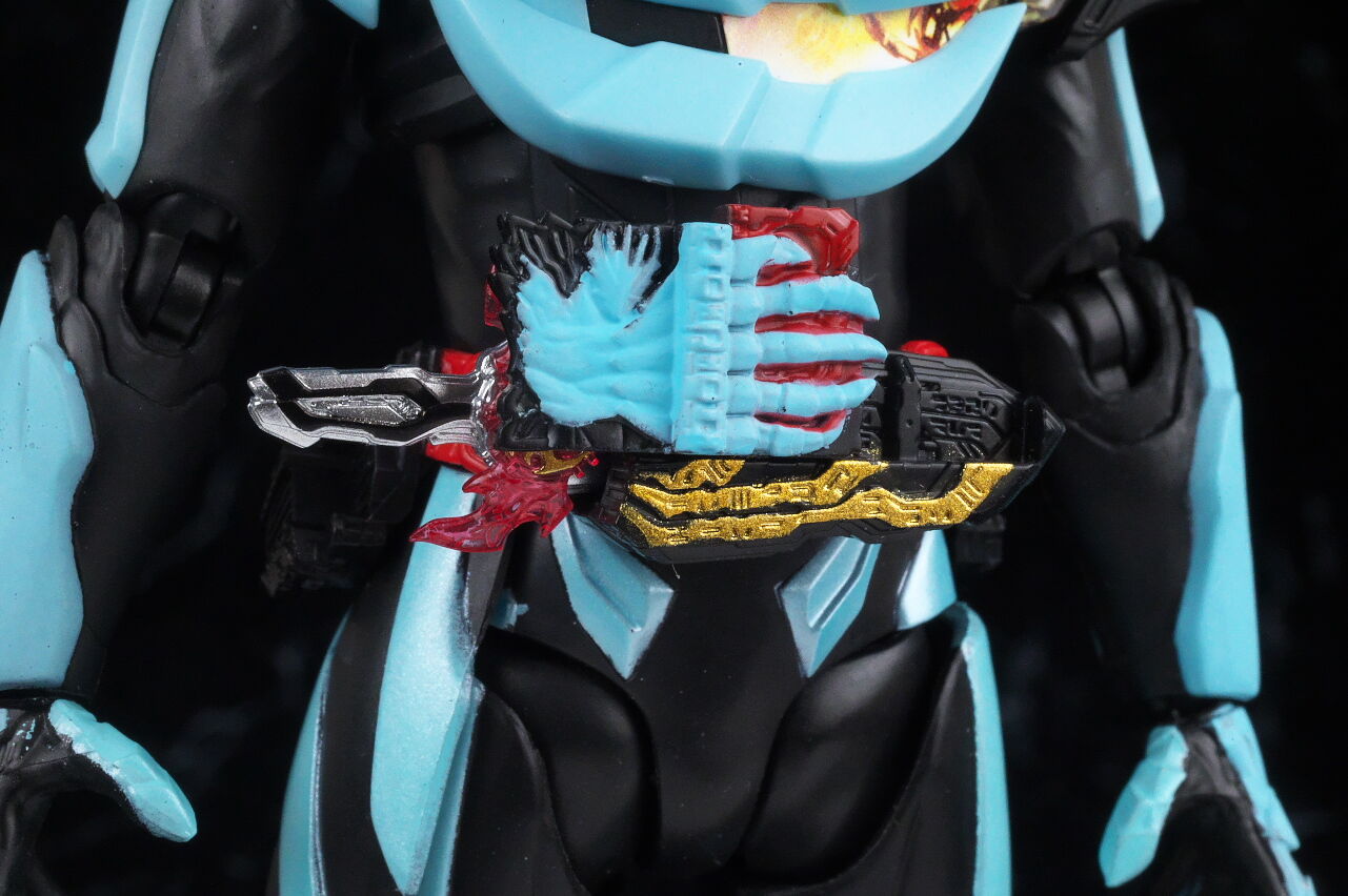 腰回り。ベルトのギミックはこれまでと共通で、プリミティブドラゴンワンダーライドブックが装填。ブックのディテールも精密。