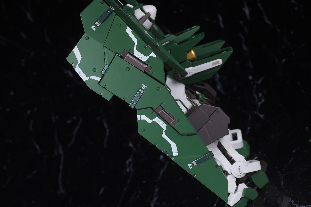 GNデヴァイズバックパックはエクシアの流用ではなく新規造形。基部は上下左右に可動し、ホルスターの取り付けも可能。