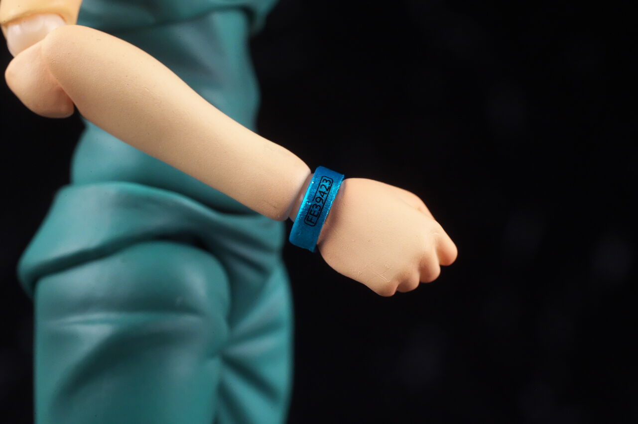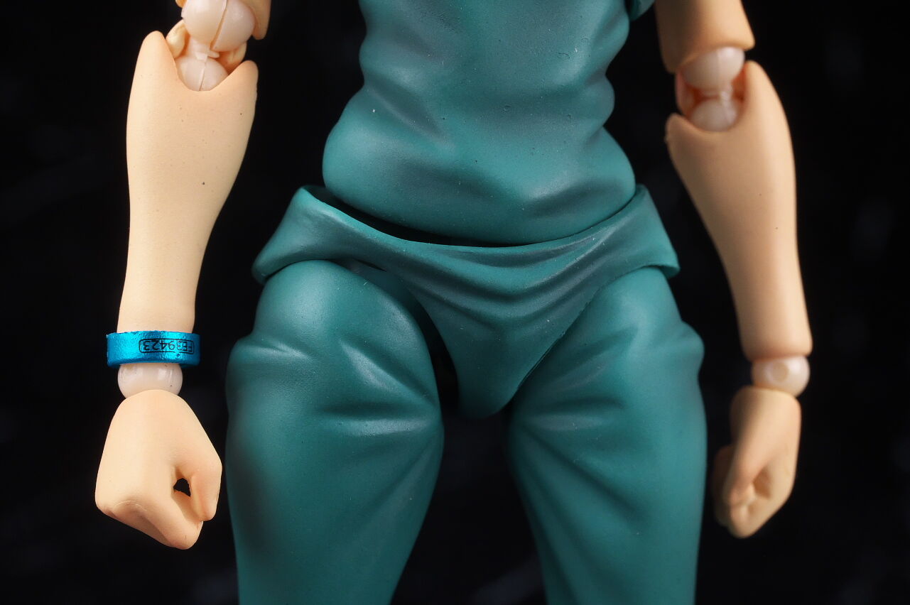 右腕には囚人番号の入ったリストバンド。取り外しも可能。
