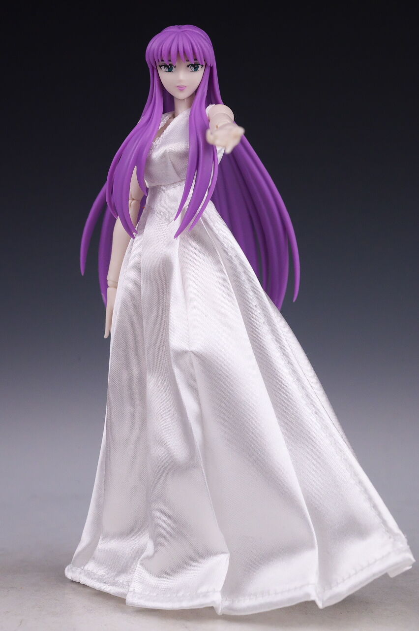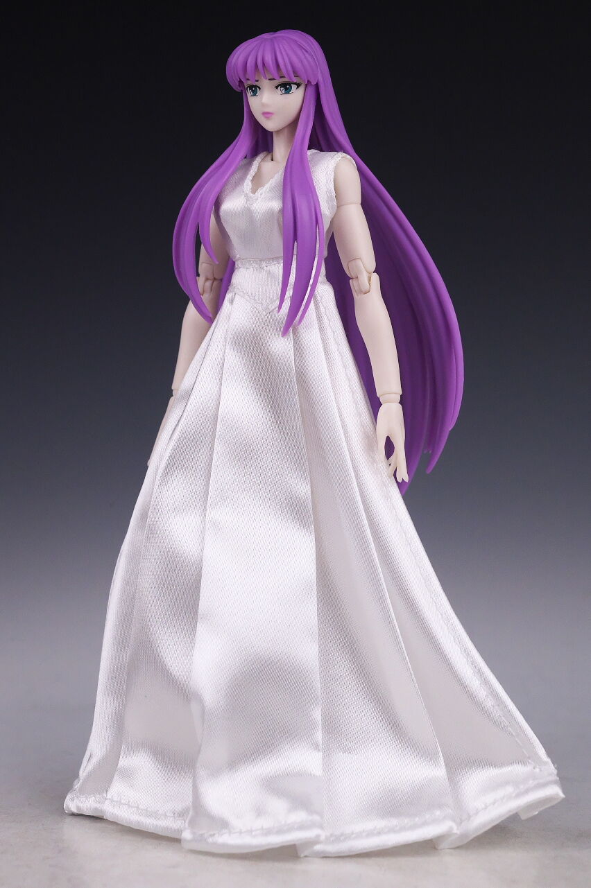 城戸沙織全身。今回はディバインサーガプレミアムセットということで、聖衣用とドレス用の2体の素体が付属。表情は兼用ですが2体同時に飾ることも可能になってました。