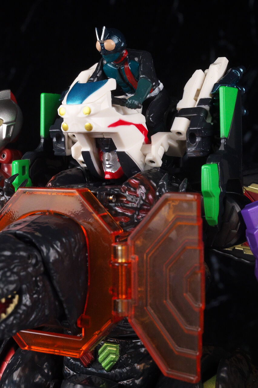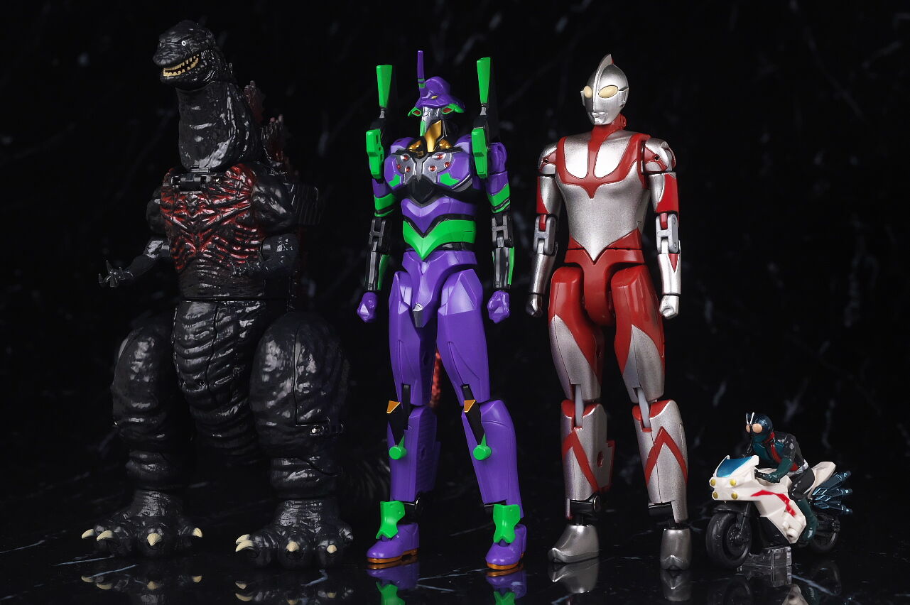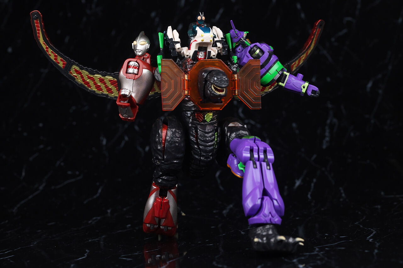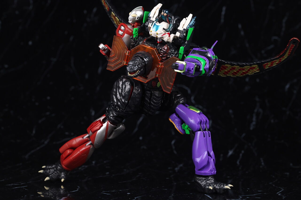 胴体となるゴジラに頭部のライダー、四肢のエヴァ、ウルトラマンを取り付け。肩には初号機の装甲、足首にはゴジラの足首を取り付け。