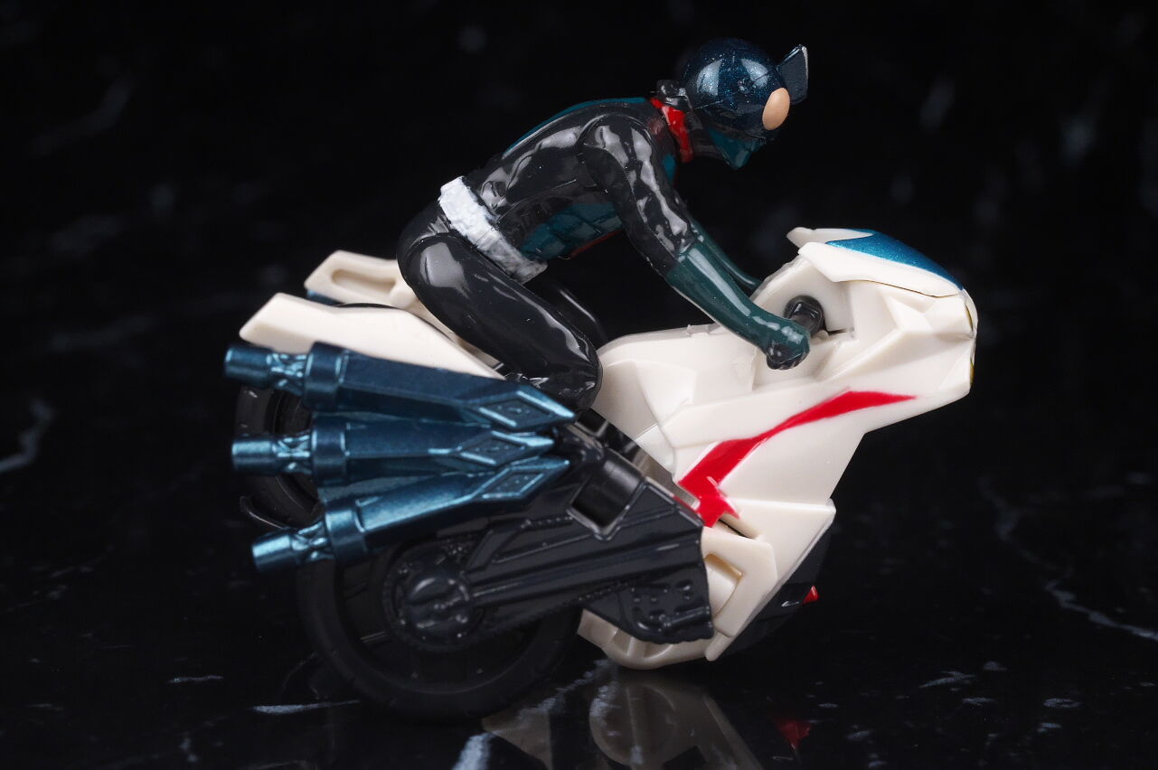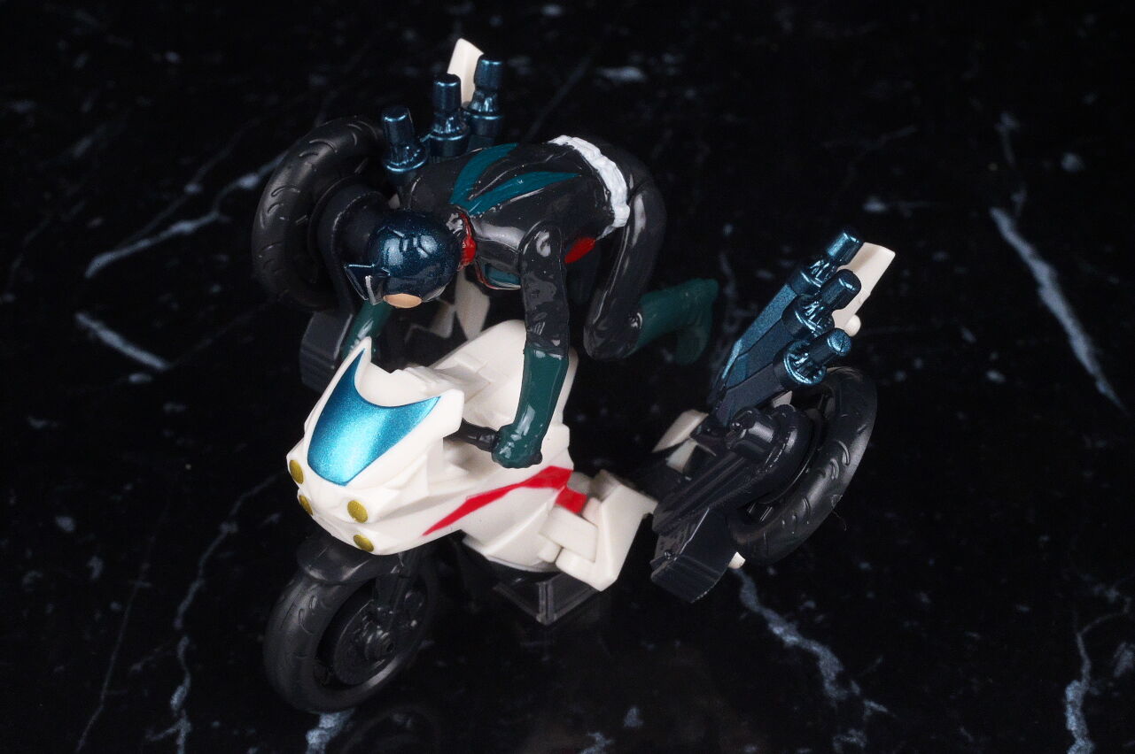 開いた左右のパーツを変形させて再度閉じ、ライダー本体もまた下ろした状態に。