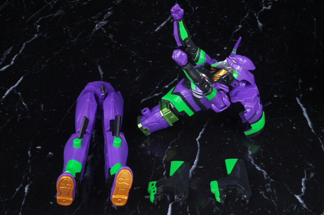 腕や足。初号機と同じく肘関節は剥き出しで、脚部内側は平ら。脚部が太長すぎるのがかなり目立つ感じでした。