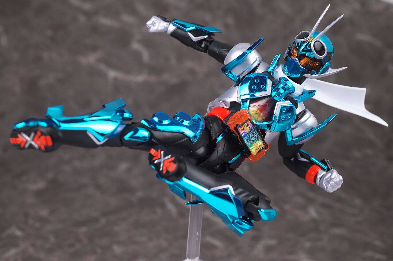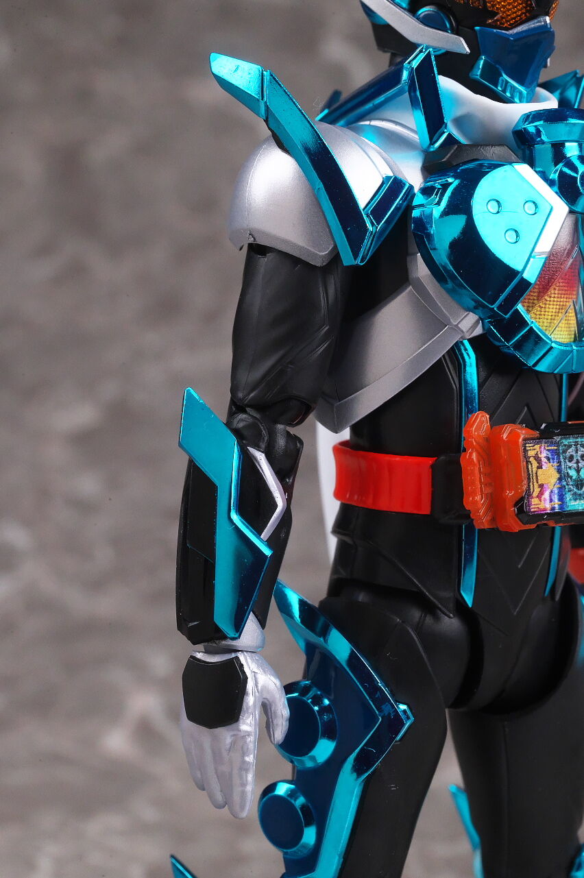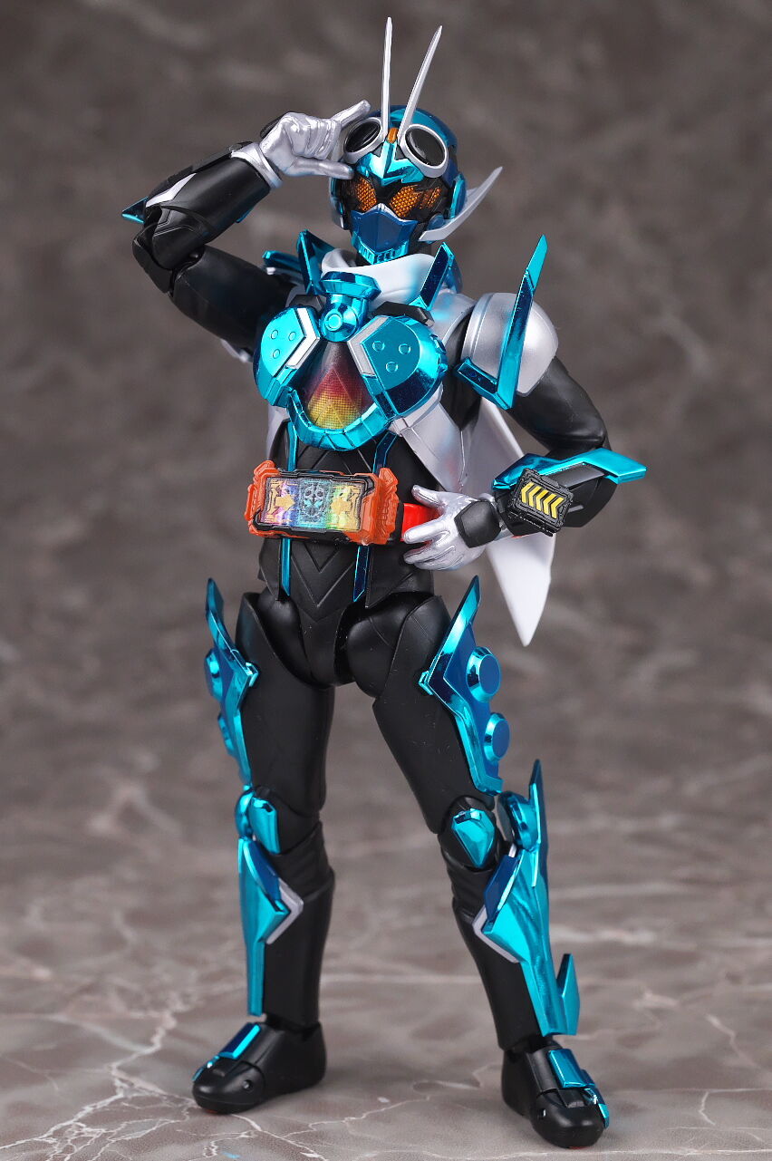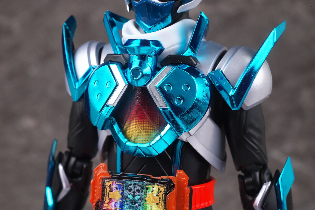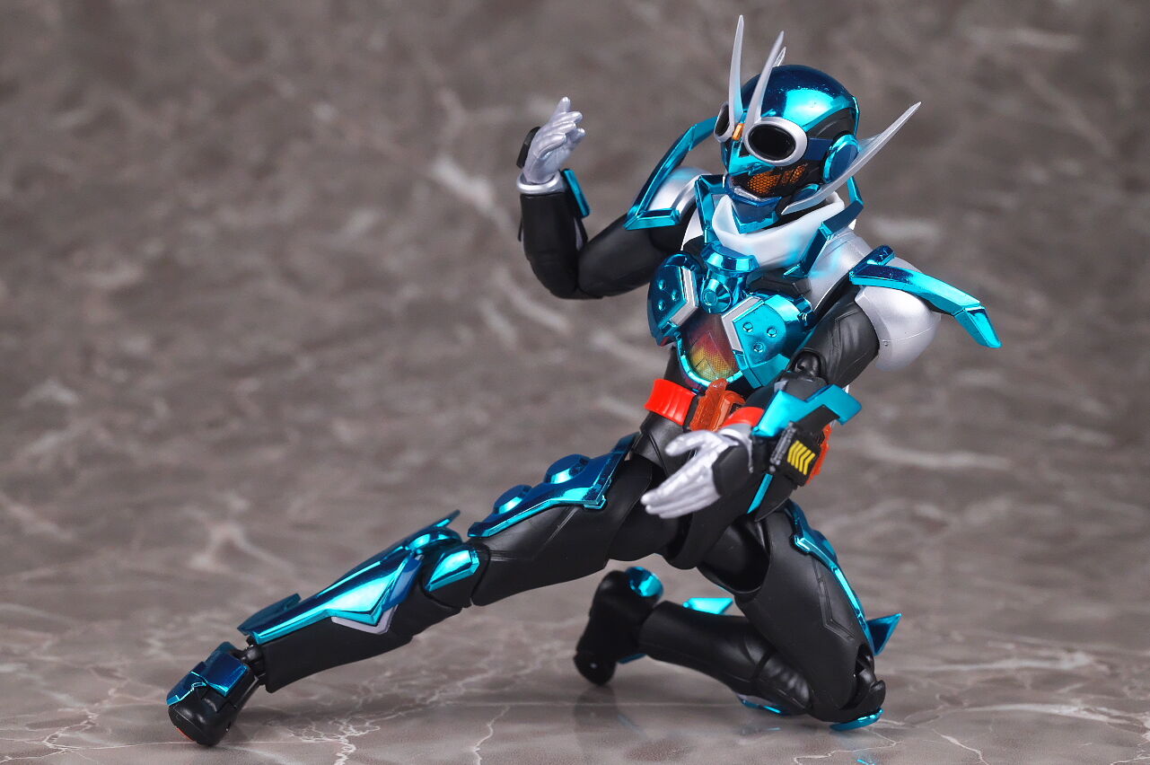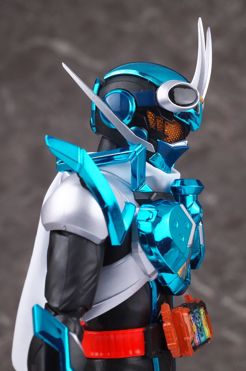 全身。プロポーションは最近のライダアーツ同様安定。今回は一番目立つ青部分がメッキになっており、メタリック塗装中心の従来の物とはかなり異なる雰囲気に仕上がってました。