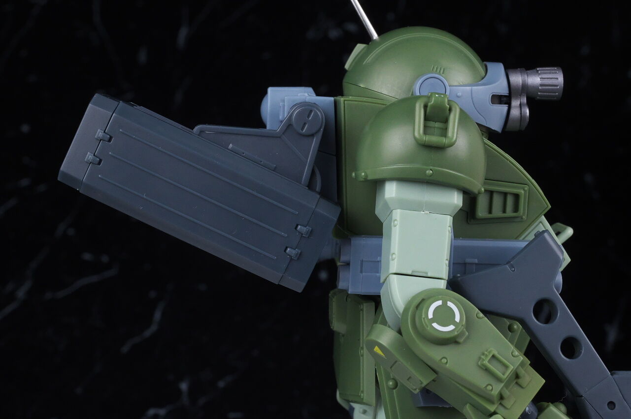 スコープドッグ特有の曲線的なフォルムも違和感なく再現。アンテナは若干上下に可動し、予備も付属。