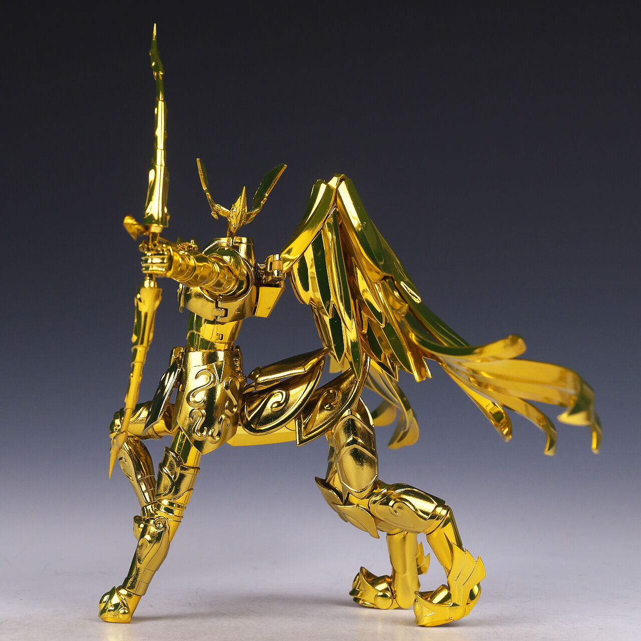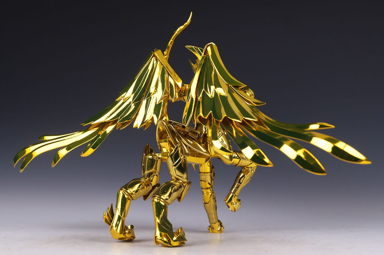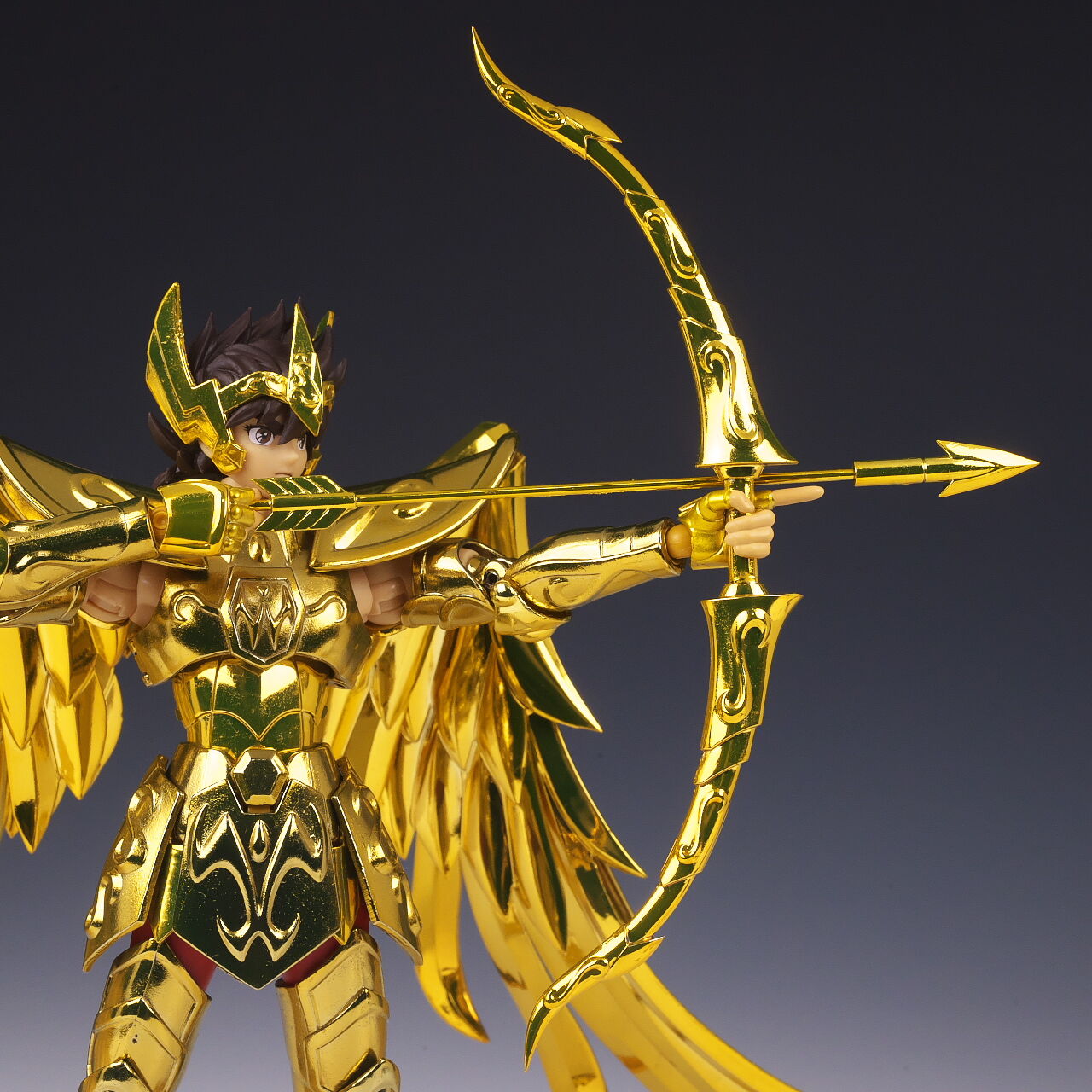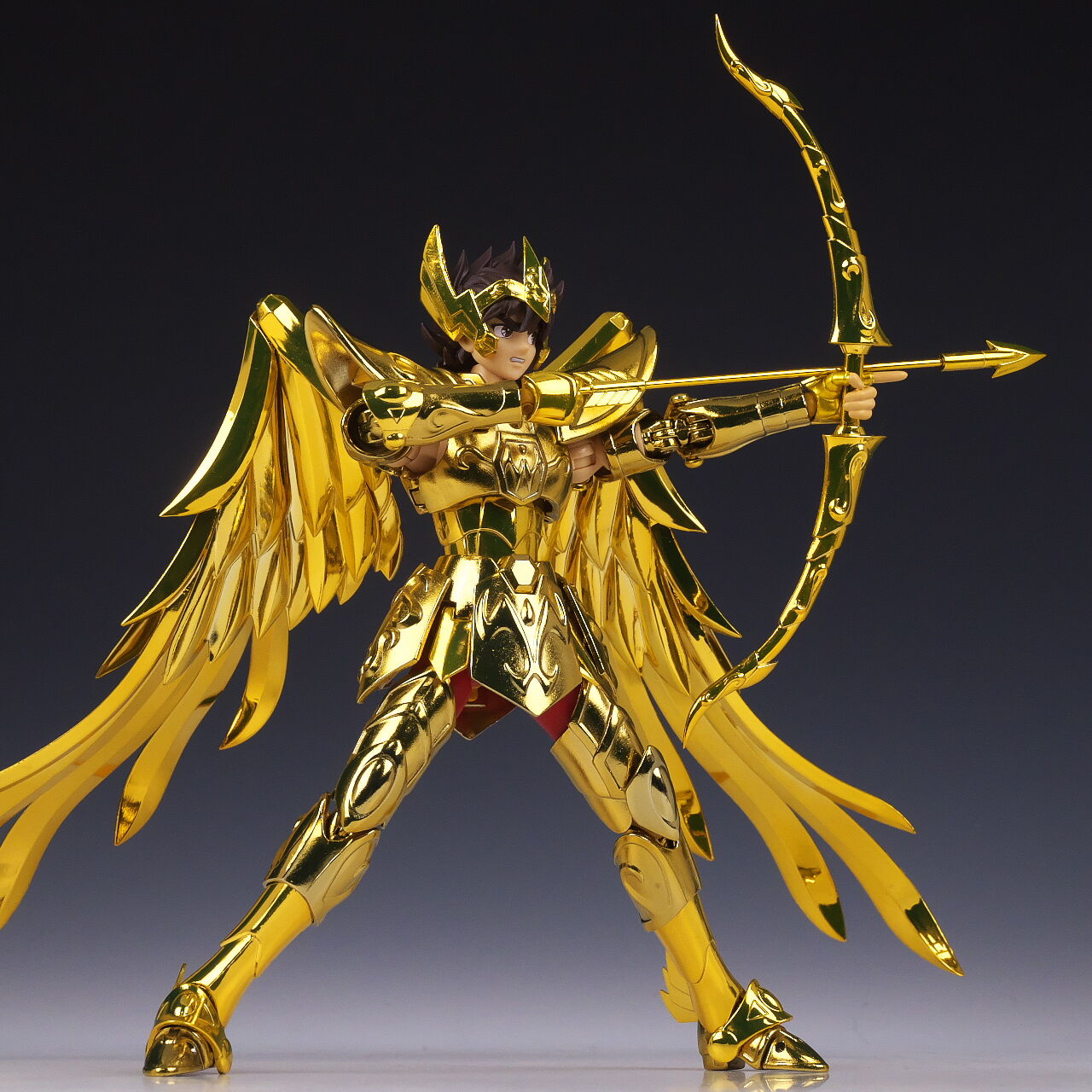 全身。EX版のサジタリアス星矢は2019年にも発売されていましたが、今回は素体がEX METALになり、表情パーツを新規造形、聖衣の色を変更してリニューアル。