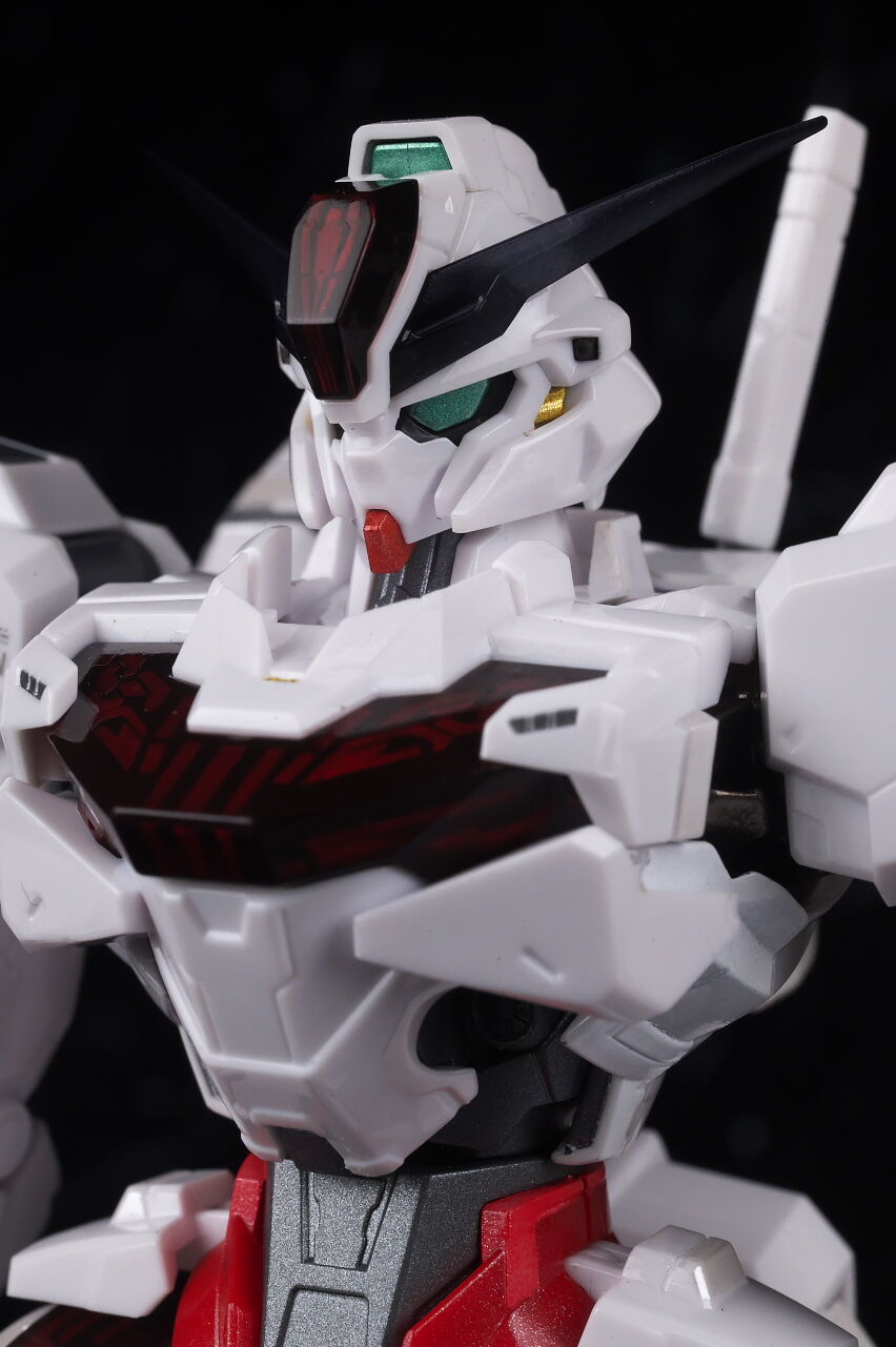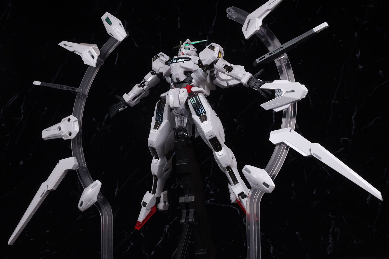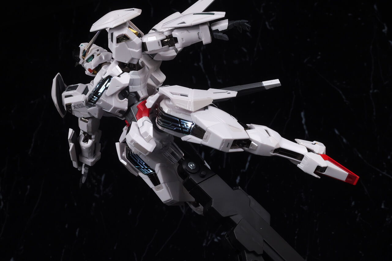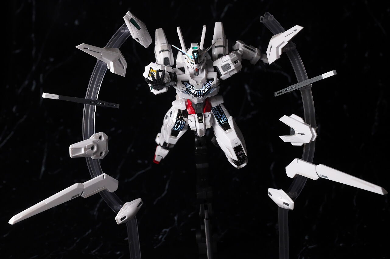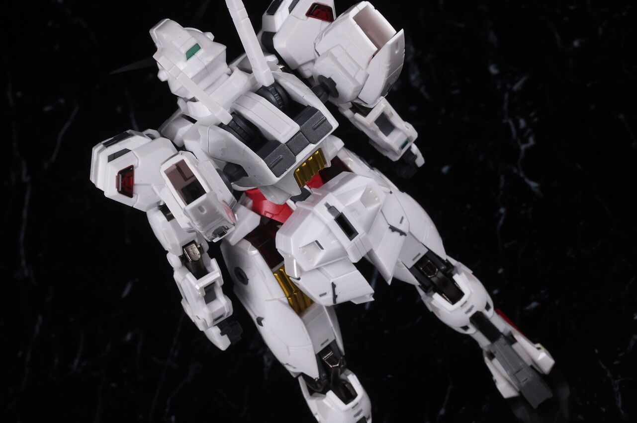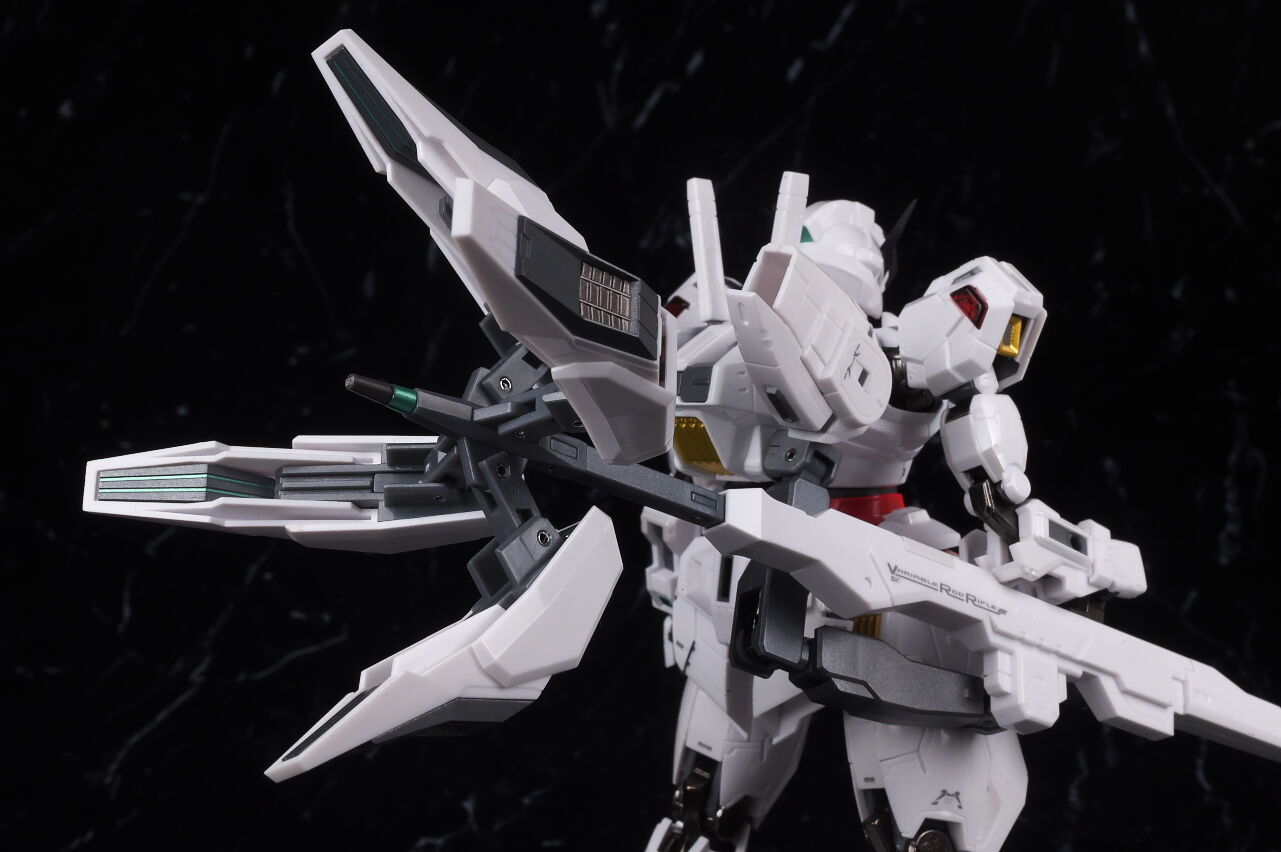可動に関してはまずまずでそこまで気になるような部分は無く、武装やシェルユニットのギミックなどもきっちり再現、エアリアルの時に目しか光らずいまいちだったライトアップギミックも、今回は胸部と太腿のシェルユニットも光るようになり、発光時の見栄えはグンと良くなって、内容に関してはエアリアルの時より色々進化してた点は良かったです。