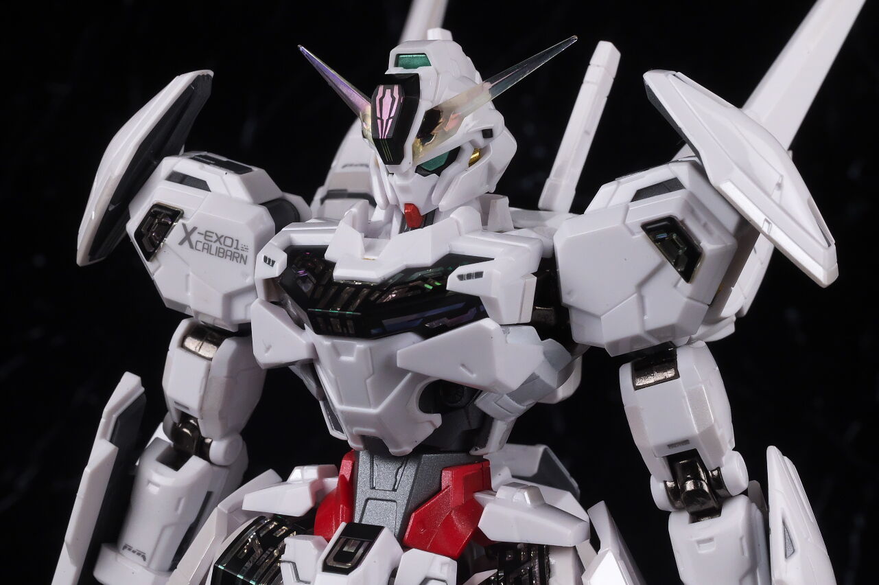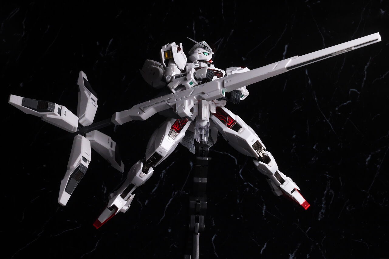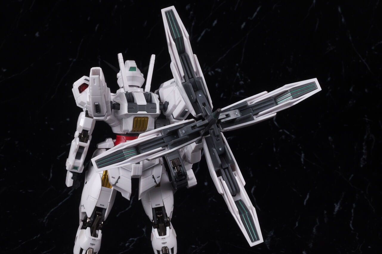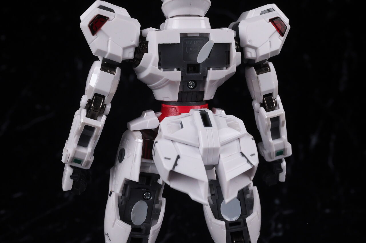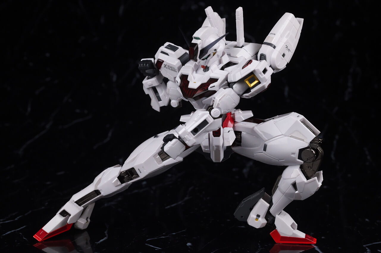 可動に関してはまずまずでそこまで気になるような部分は無く、武装やシェルユニットのギミックなどもきっちり再現、エアリアルの時に目しか光らずいまいちだったライトアップギミックも、今回は胸部と太腿のシェルユニットも光るようになり、発光時の見栄えはグンと良くなって、内容に関してはエアリアルの時より色々進化してた点は良かったです。