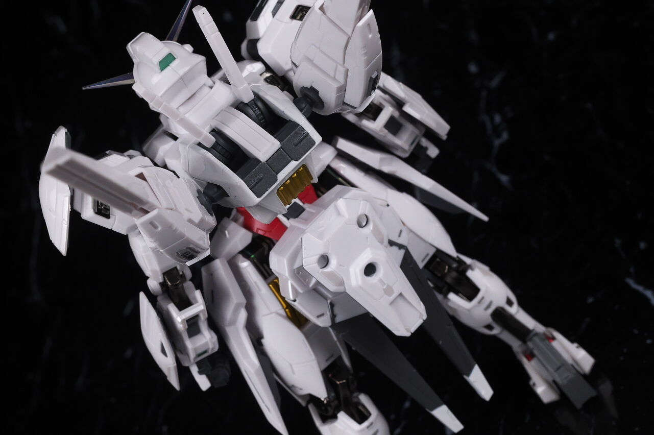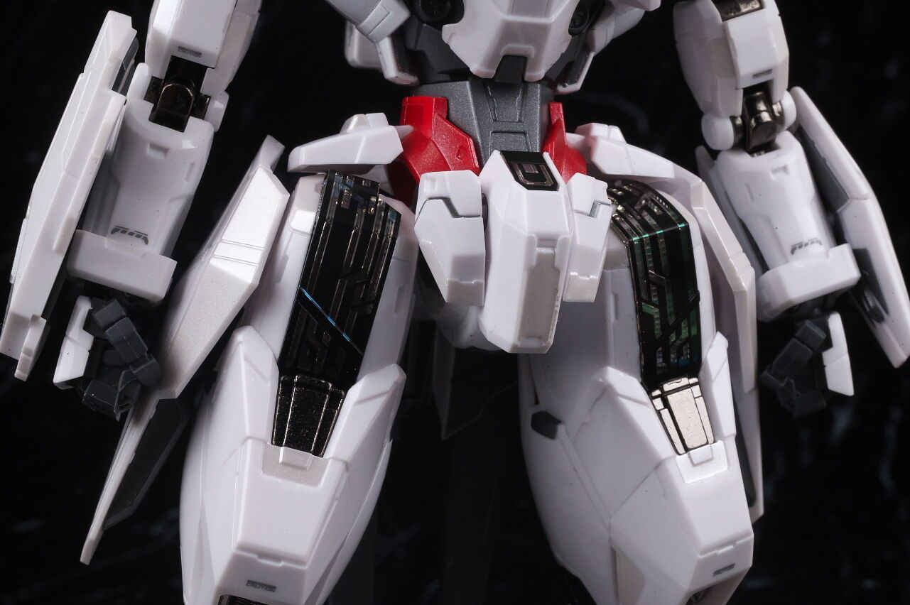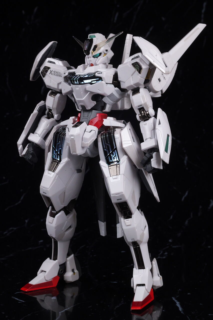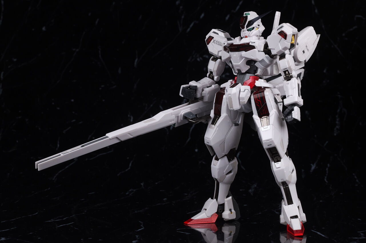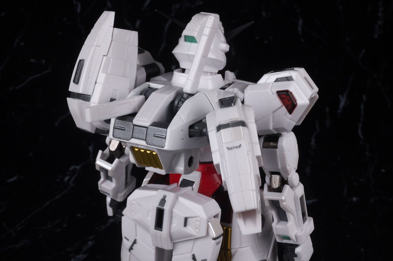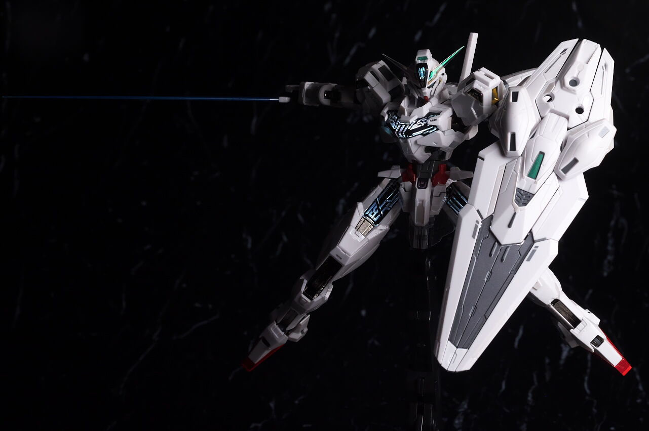 可動に関してはまずまずでそこまで気になるような部分は無く、武装やシェルユニットのギミックなどもきっちり再現、エアリアルの時に目しか光らずいまいちだったライトアップギミックも、今回は胸部と太腿のシェルユニットも光るようになり、発光時の見栄えはグンと良くなって、内容に関してはエアリアルの時より色々進化してた点は良かったです。