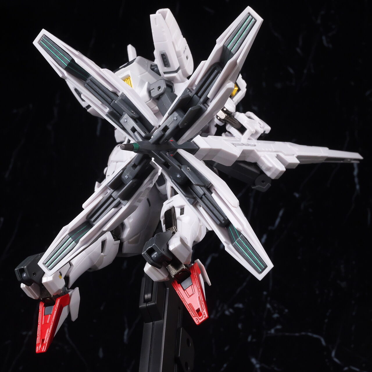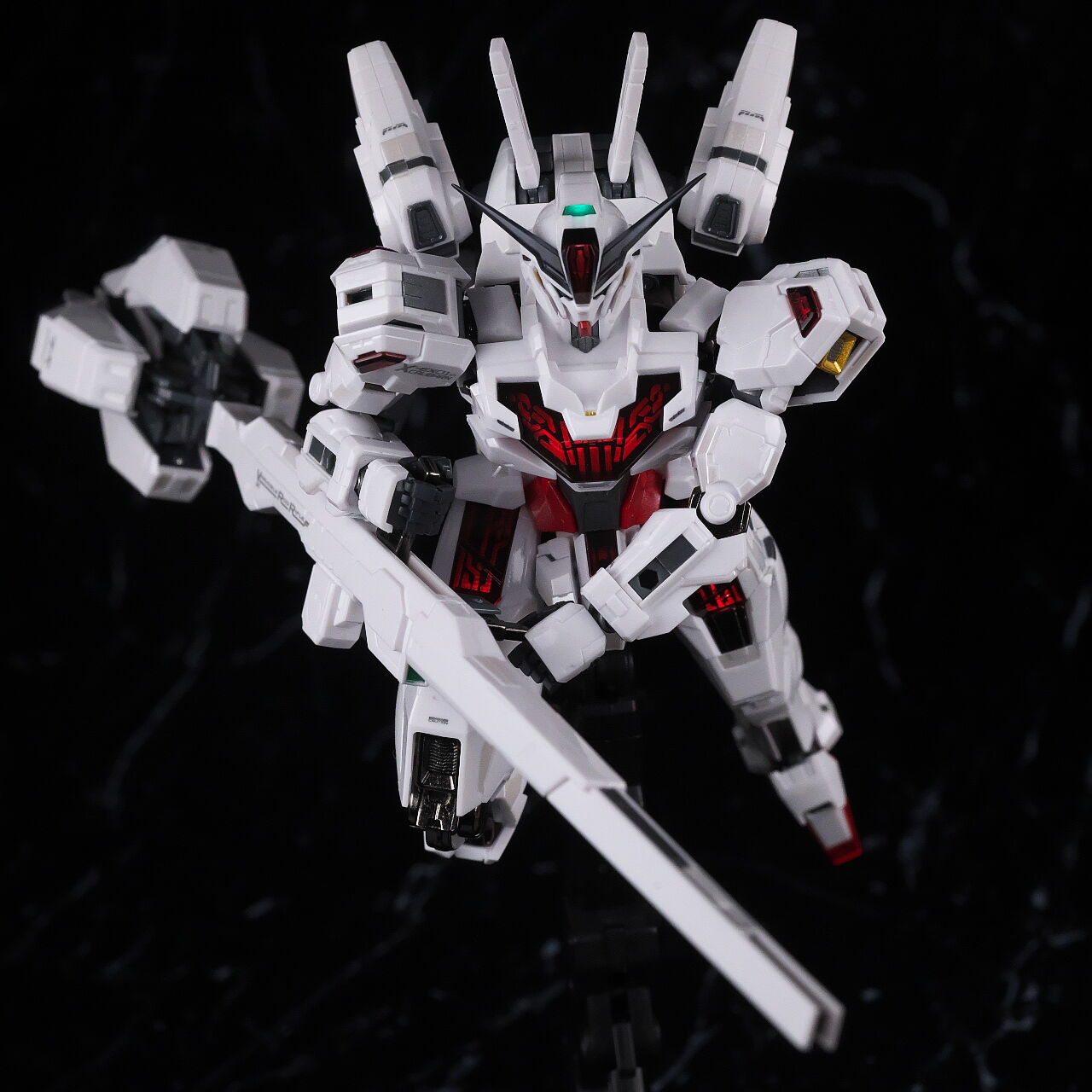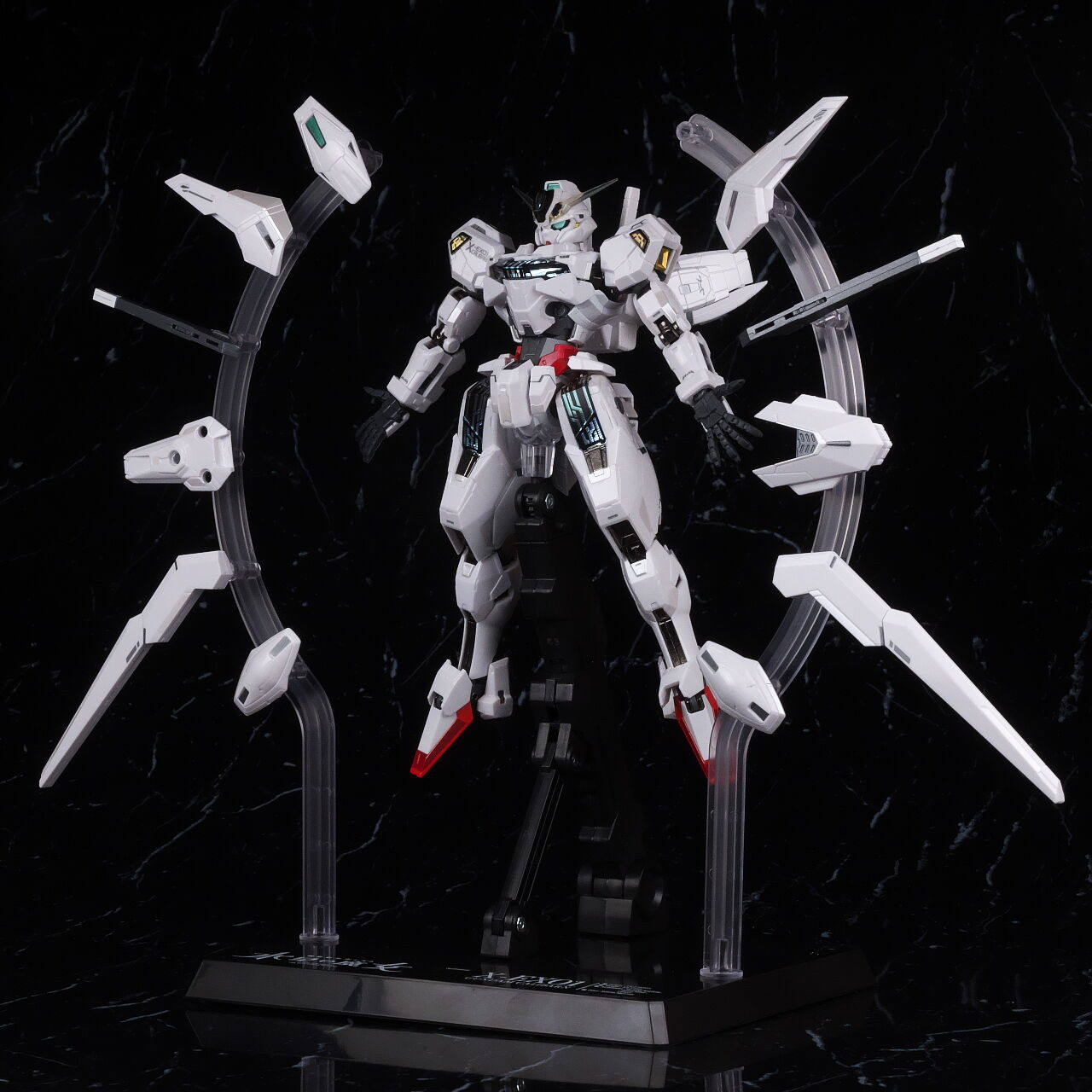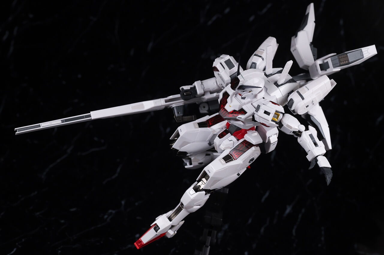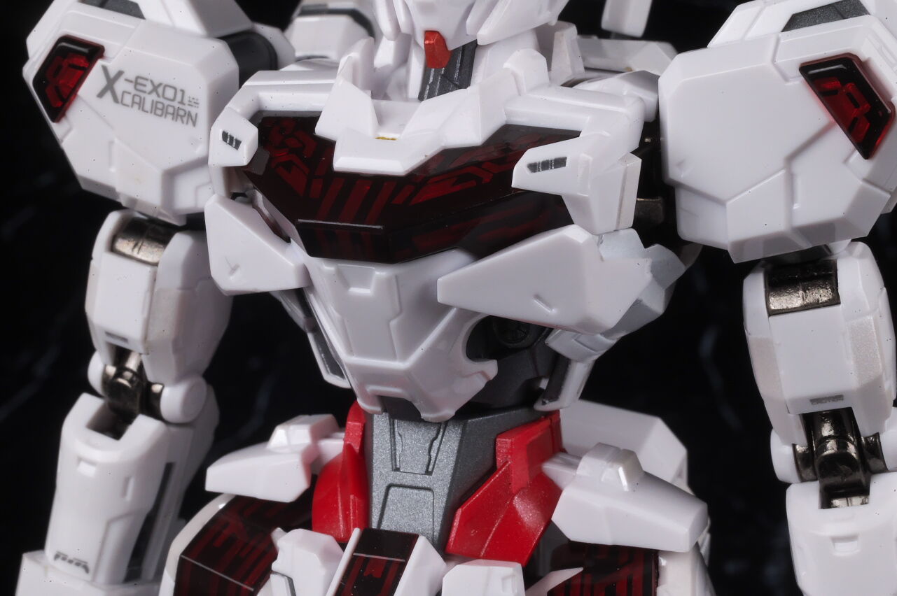可動に関してはまずまずでそこまで気になるような部分は無く、武装やシェルユニットのギミックなどもきっちり再現、エアリアルの時に目しか光らずいまいちだったライトアップギミックも、今回は胸部と太腿のシェルユニットも光るようになり、発光時の見栄えはグンと良くなって、内容に関してはエアリアルの時より色々進化してた点は良かったです。
