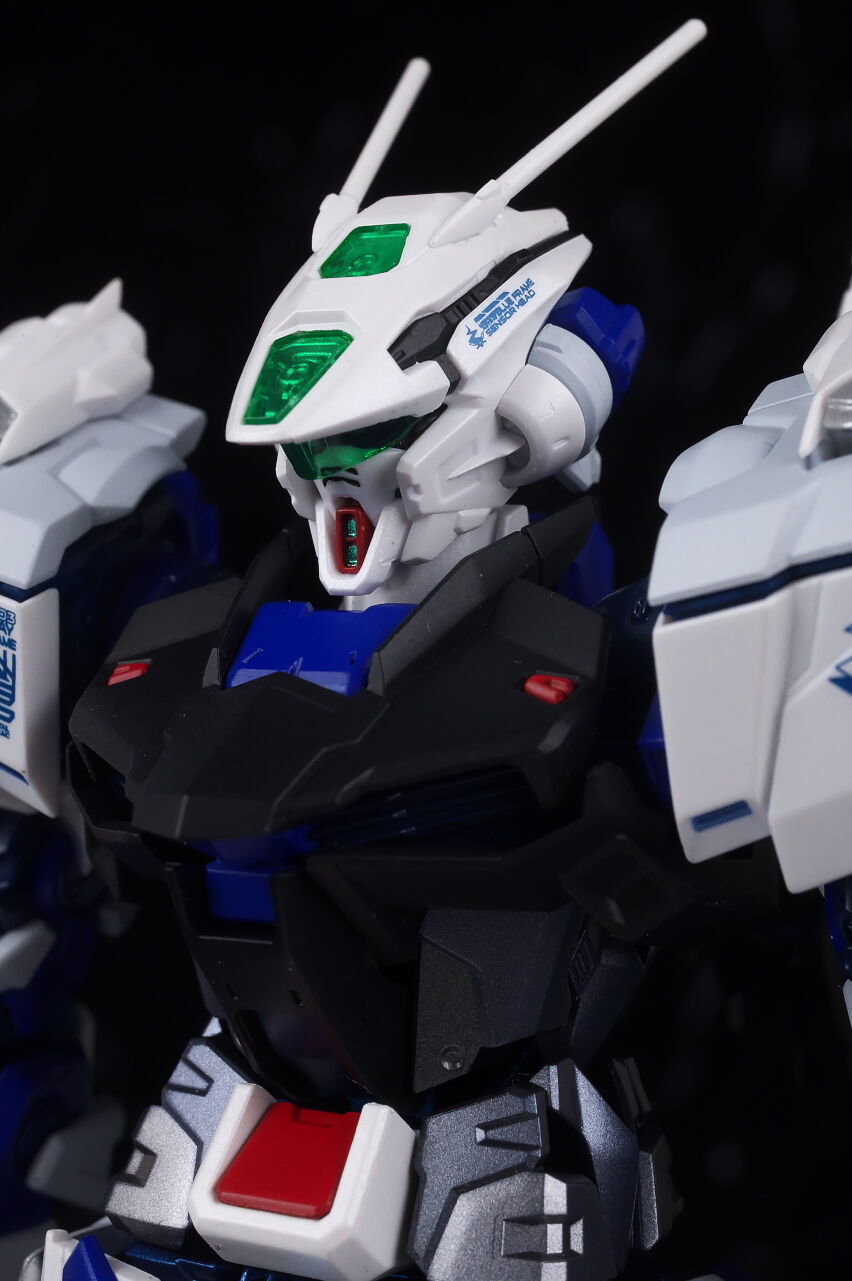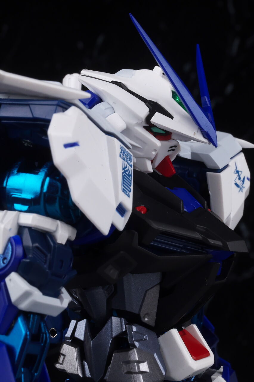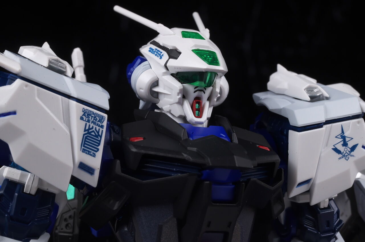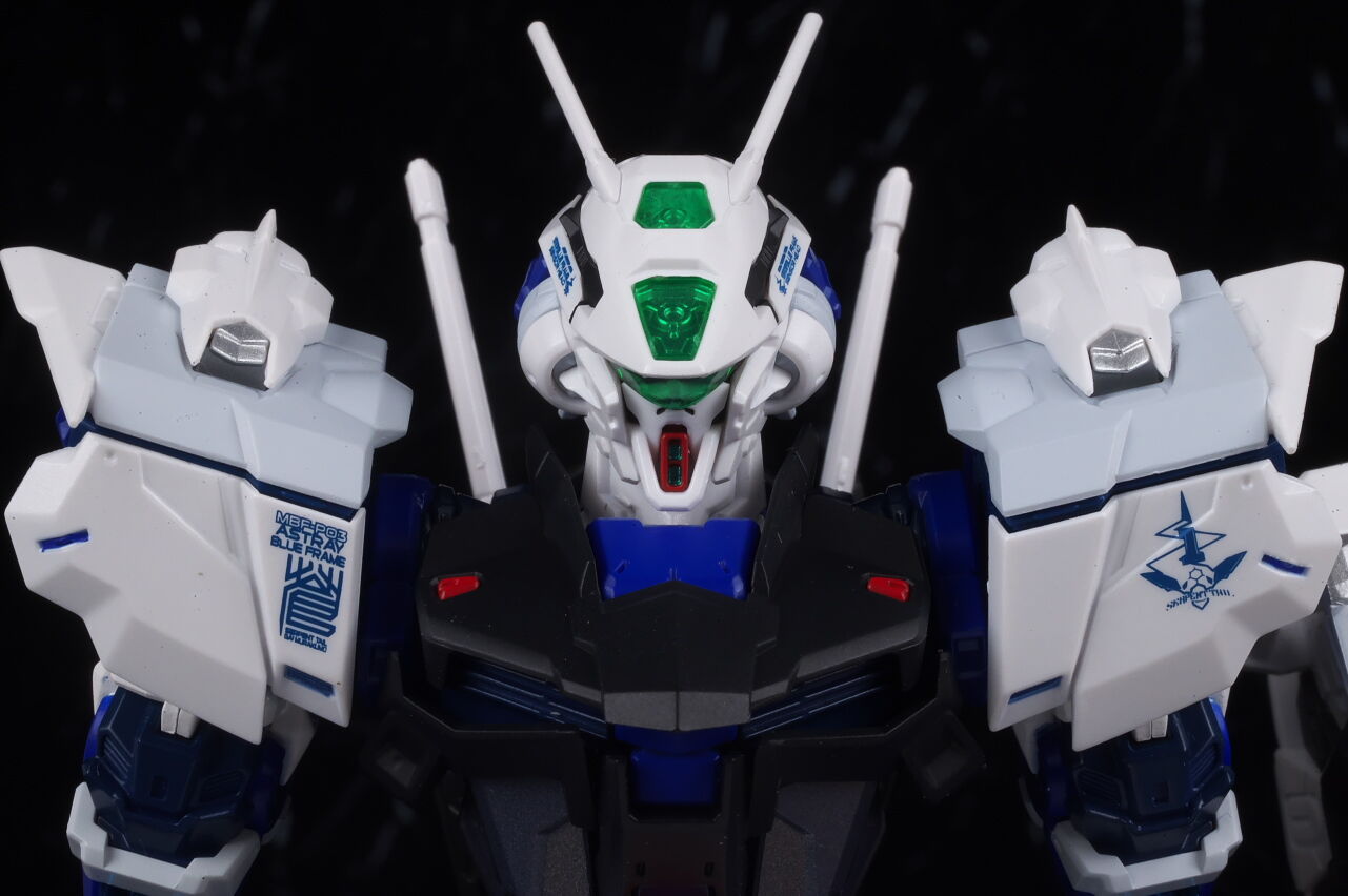 顔。頭部造形は旧版や他のフレームと変わらず昔のまま。アンテナは旧版はメタリック塗装でしたが今回は普通の青なので落ち着いた印象に変化。