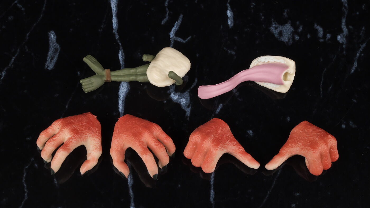 舌を伸ばした状態の顎パーツと、