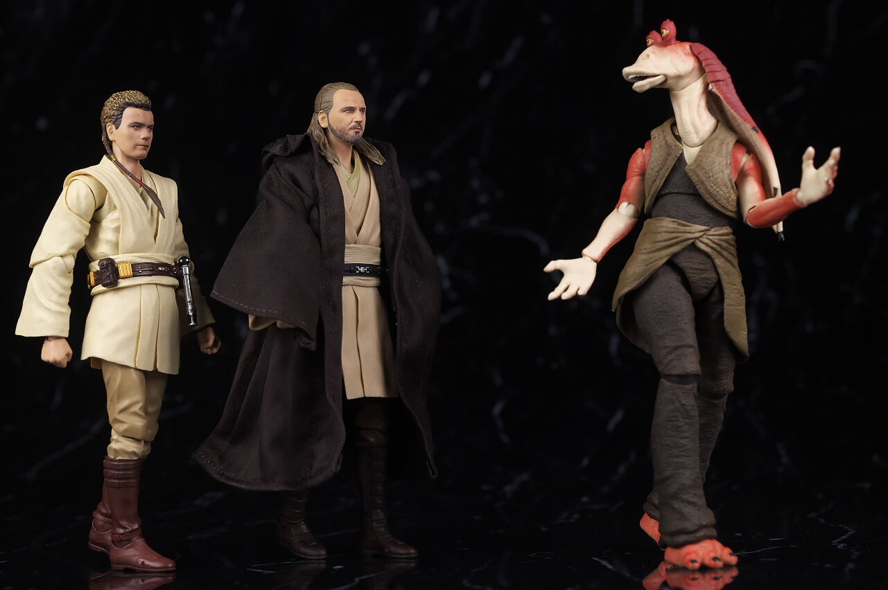 クワイガンは最近クロークとポンチョ付きの新版が出たので、そちらを使うと劇中そのままの再現が可能。