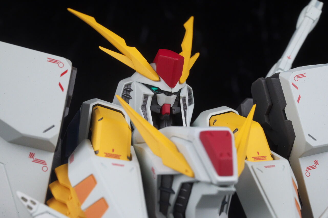 顔。頭部デザインも大きく変化しており、旧版にあったへの字スリットが無くなり、アンテナや頬部分なども大きく伸びて異形感がアップ。