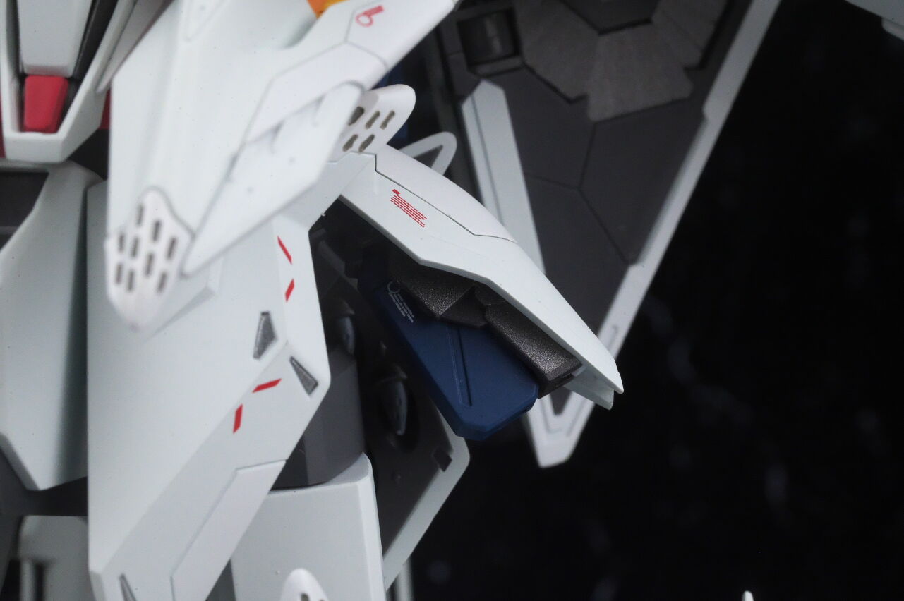 各部位など。特徴的な陣羽織のようなミノフスキークラフトは旧版よりシャープな造形になり、また色も青から白に変更。