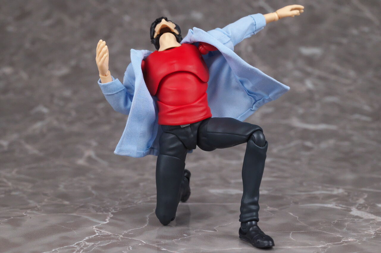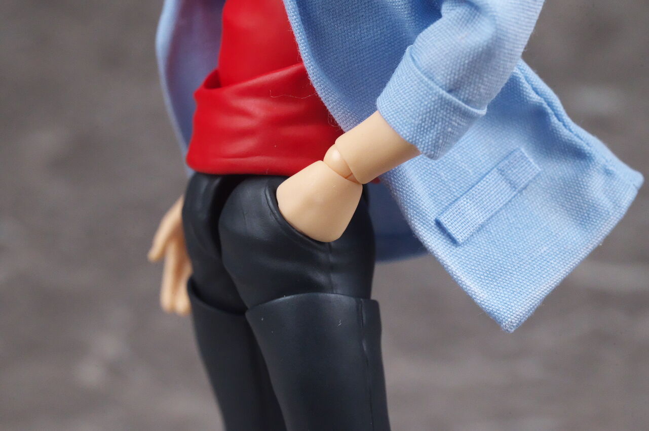 上着が布素材のフィギュアは大体そうですが、襟が立ったり裾が広がると違和感が出るので、ポーズごとに調整しないといけないのはちょっと面倒でした。