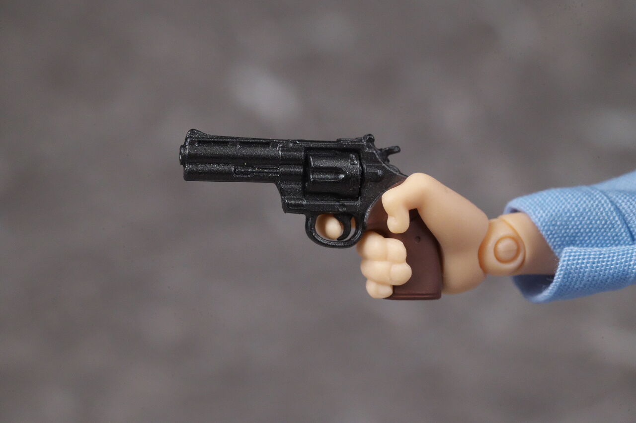 銃。お馴染みのコルトパイソンが付属し、持ち手もぴったりフィット。人差し指は伸ばした状態の物も付属。