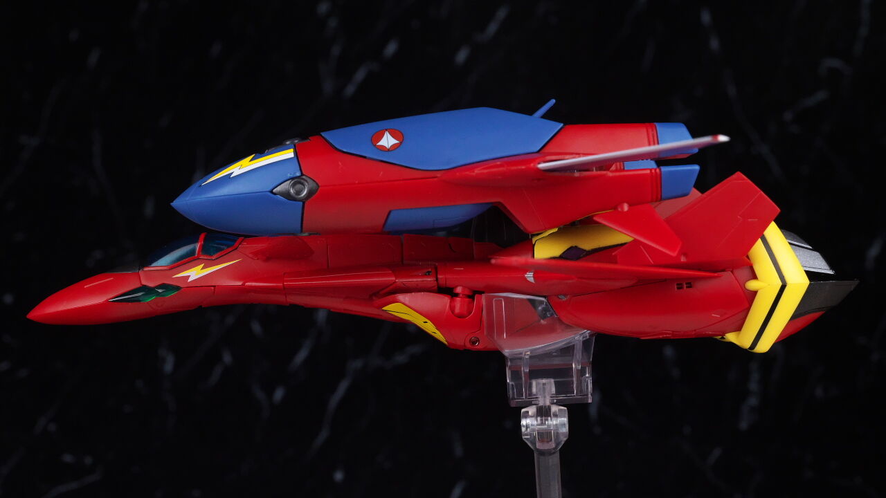 HI-METAL R VF-19改 ファイヤーバルキリーのファイター形態と並べた状態。付属の台座で2機並べたディスプレイが可能。