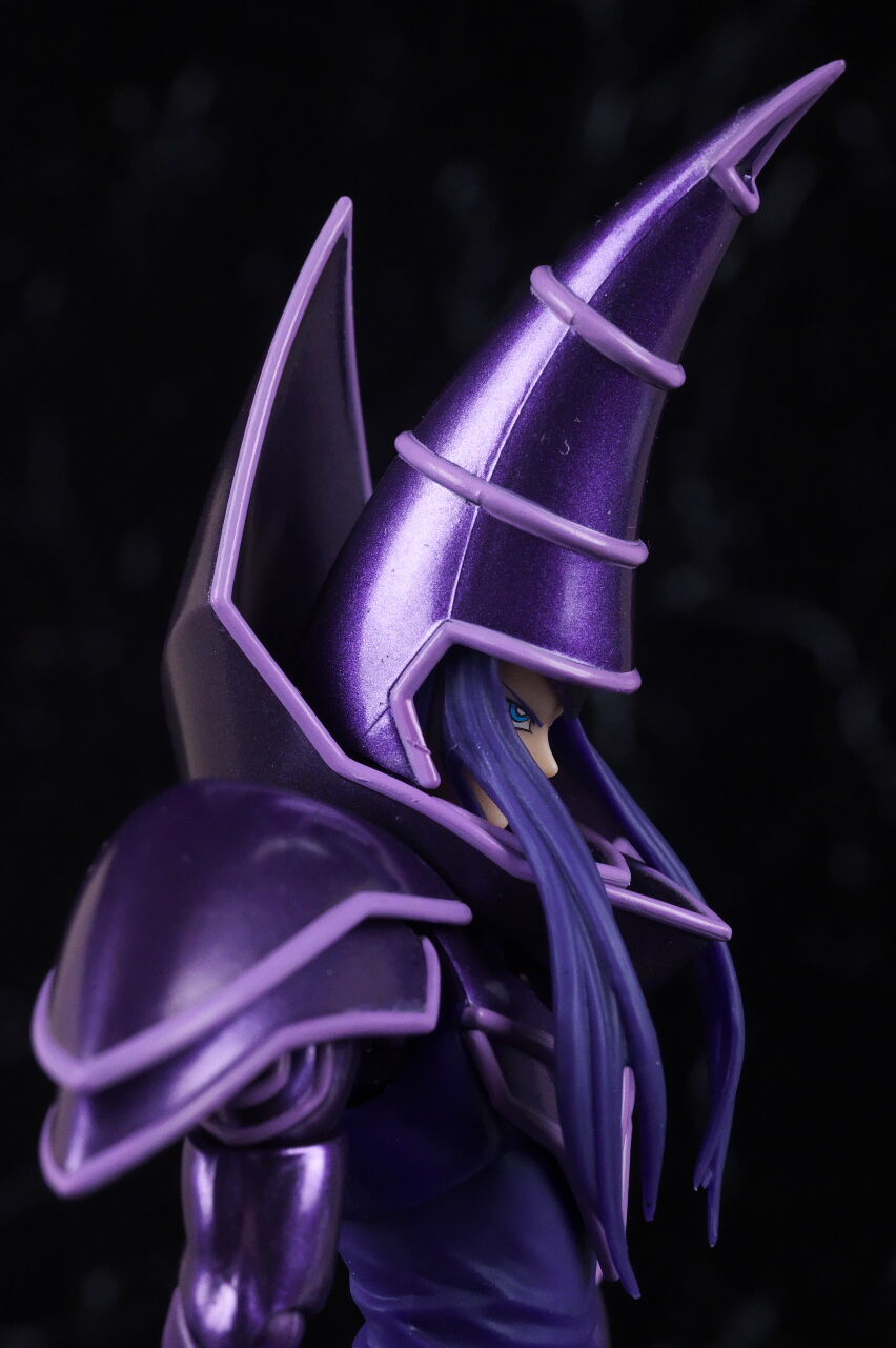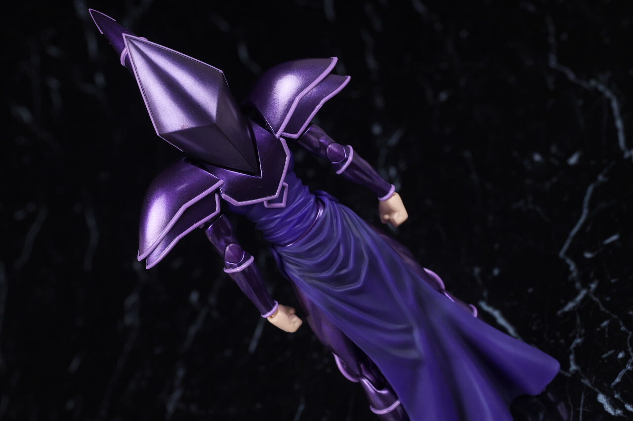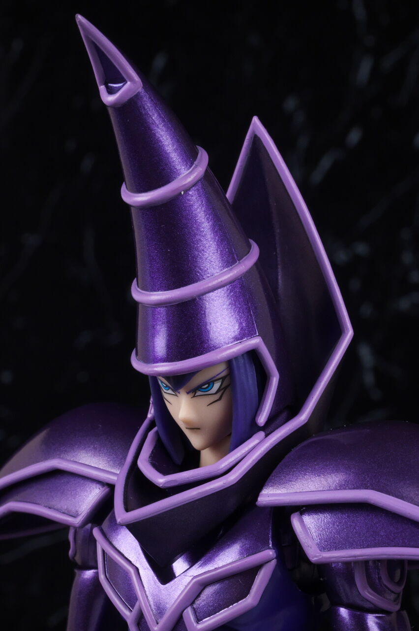 全身。普通の人型なのでSHFっぽいですが、同じ遊戯王の青眼の白龍などと同じモンアツでの発売。全高は約185mmと少し大きめで、細身な体型やローブのデザインなど忠実に再現。