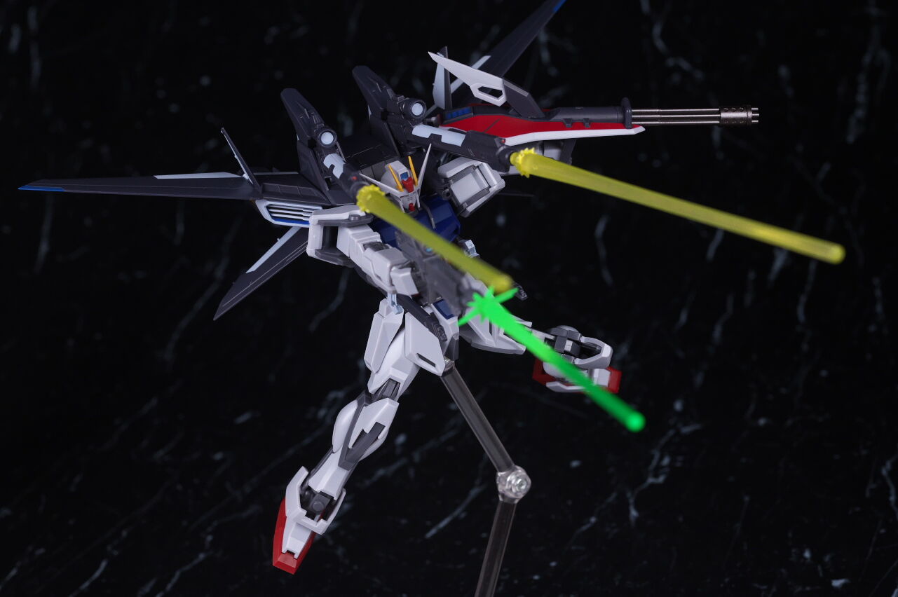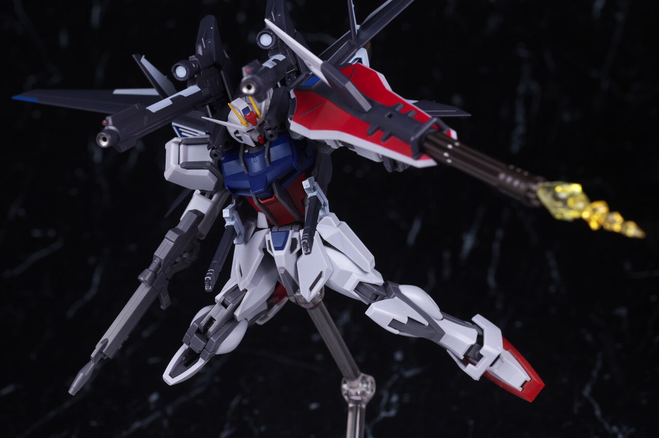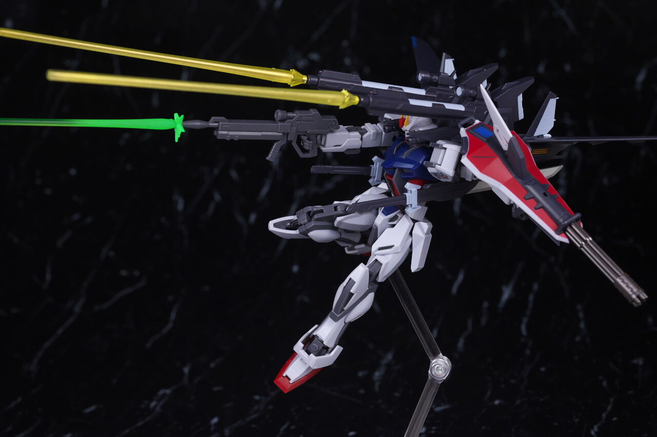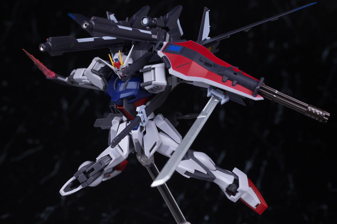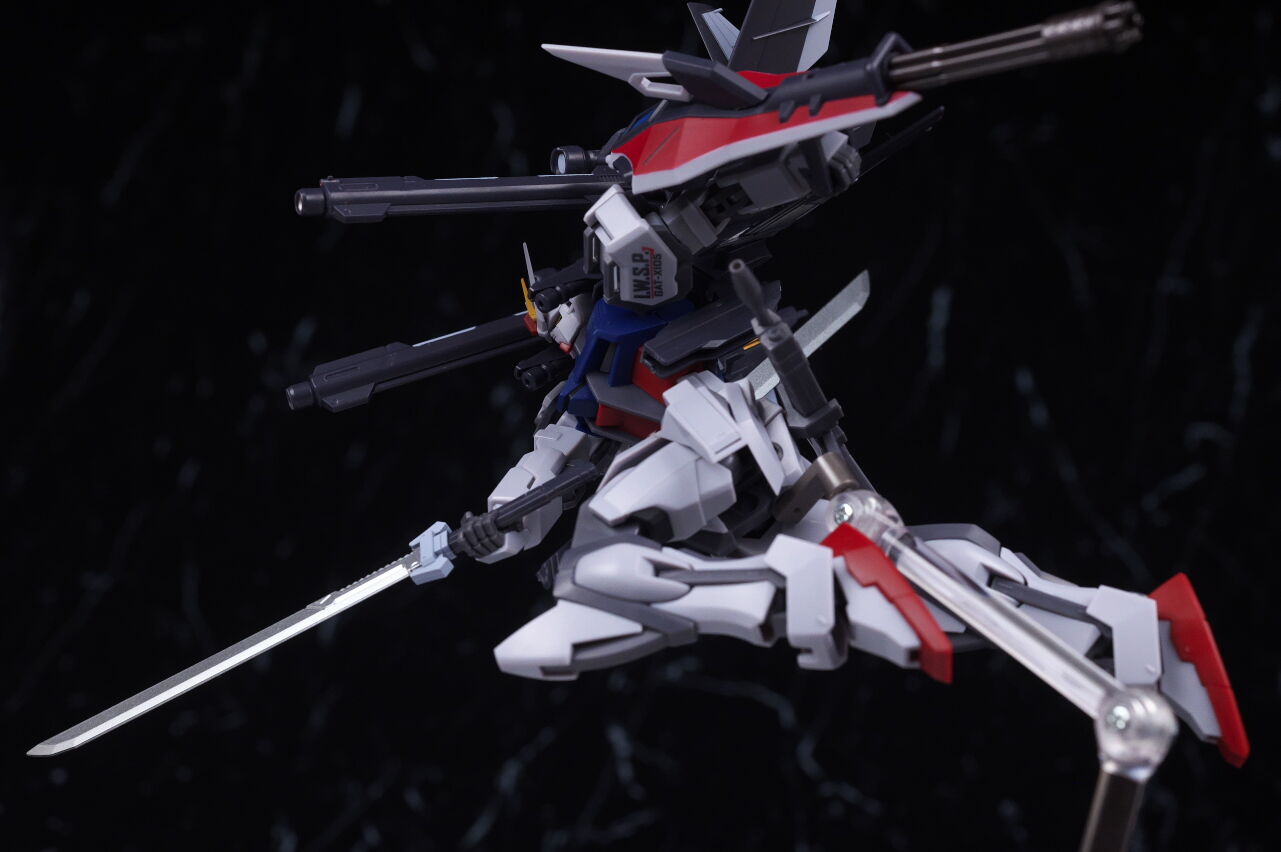 ストライク本体については設定に準じてカラーリングが暗くなり、左肩にマーキングが追加されただけで、造形に関しては同じなので、可動など基本的な出来はノーマルと変わらず。