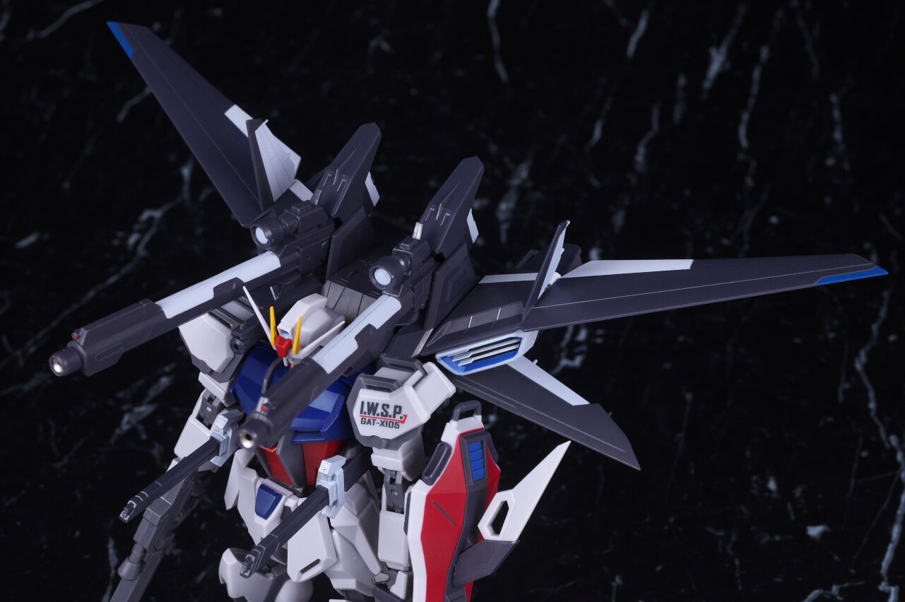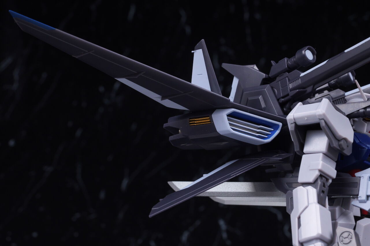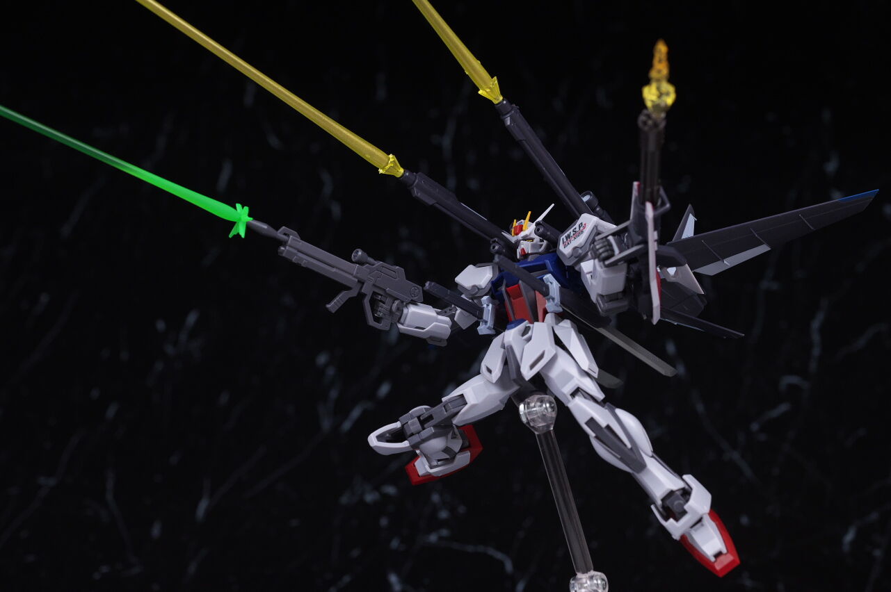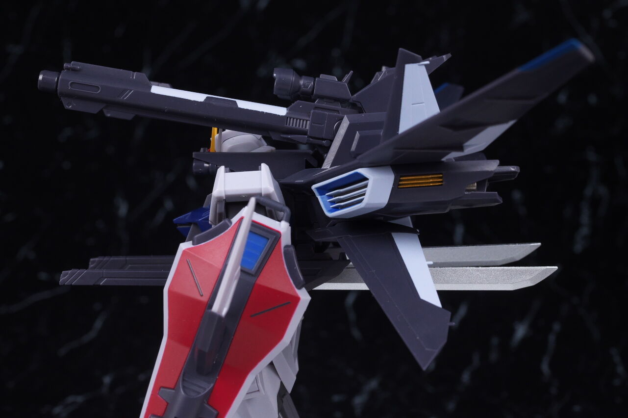 ストライク本体については設定に準じてカラーリングが暗くなり、左肩にマーキングが追加されただけで、造形に関しては同じなので、可動など基本的な出来はノーマルと変わらず。