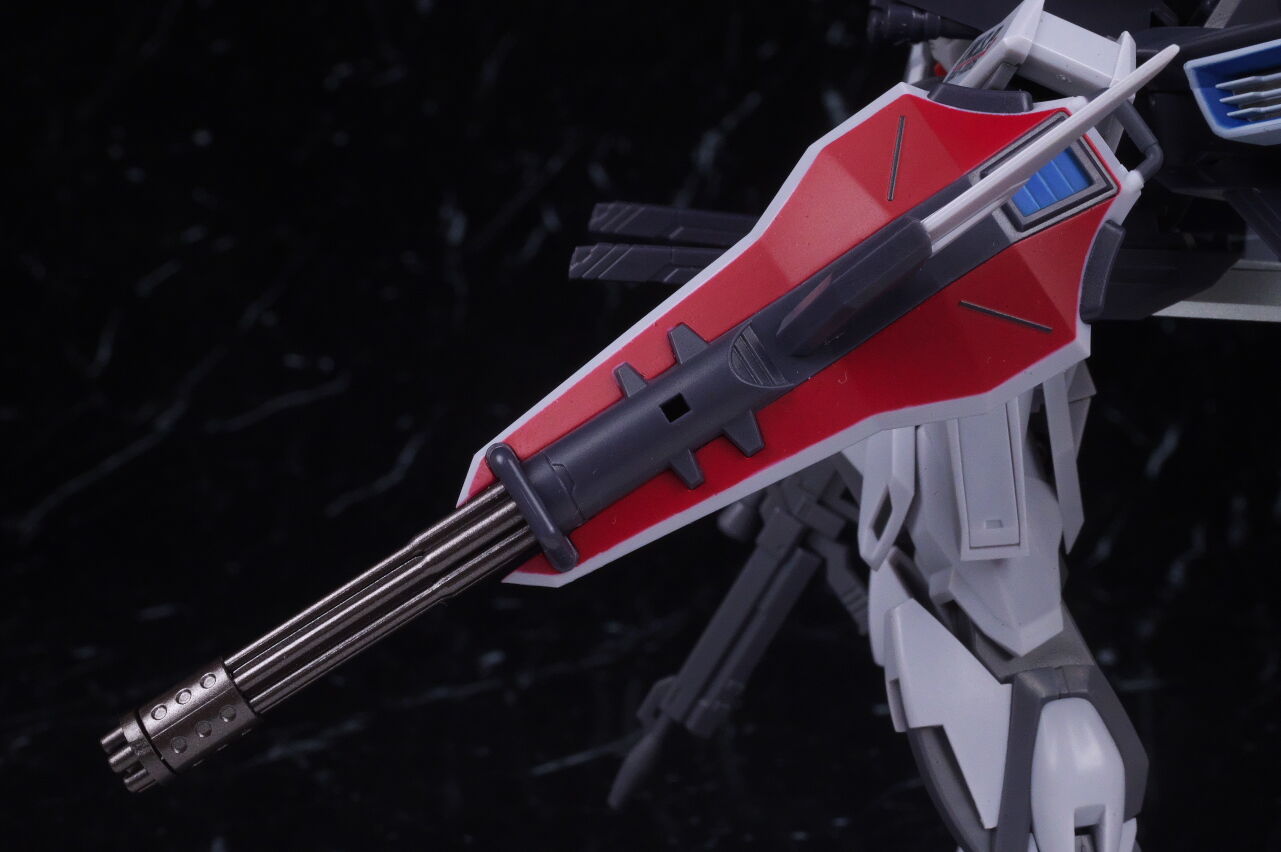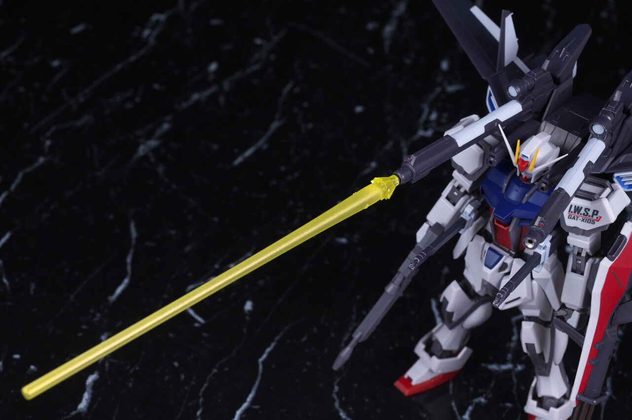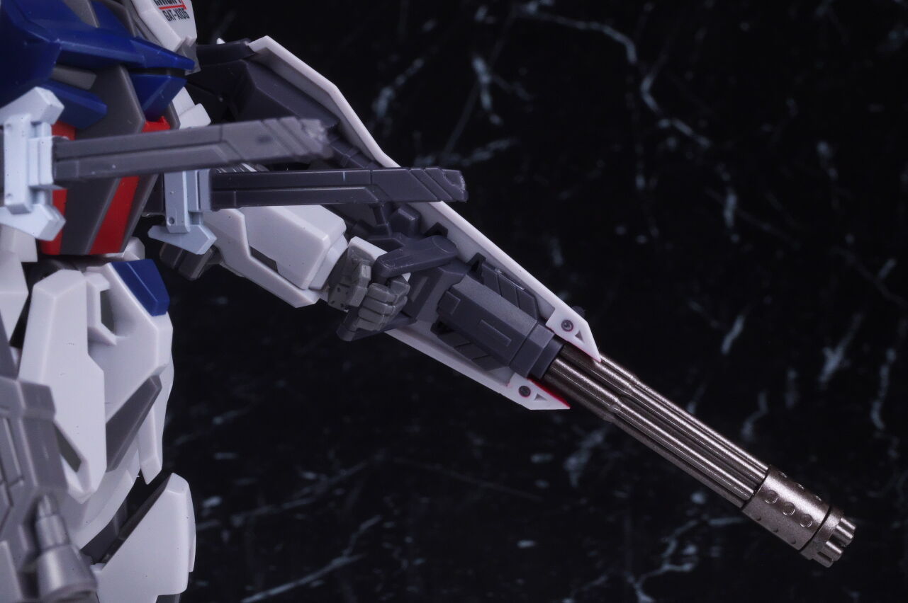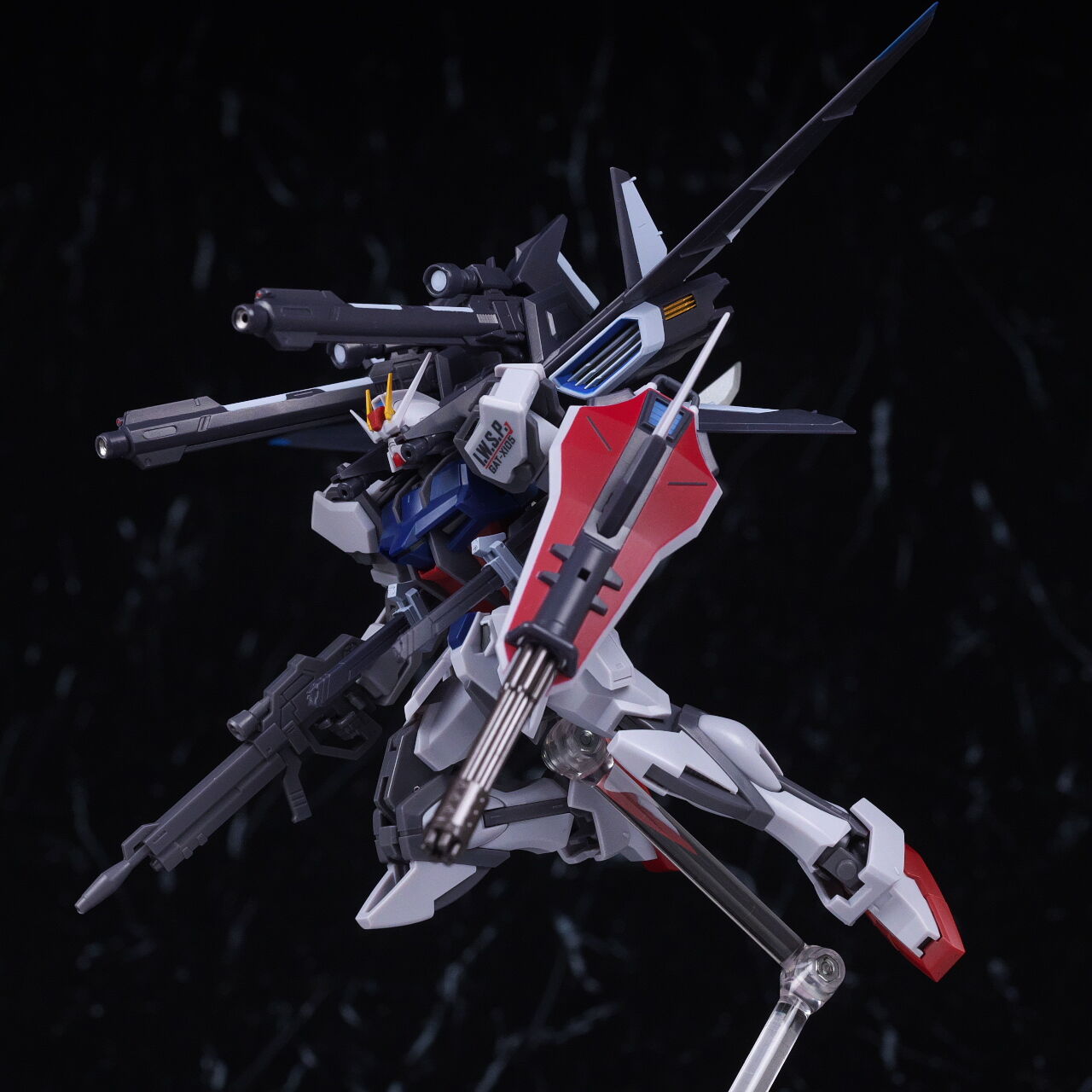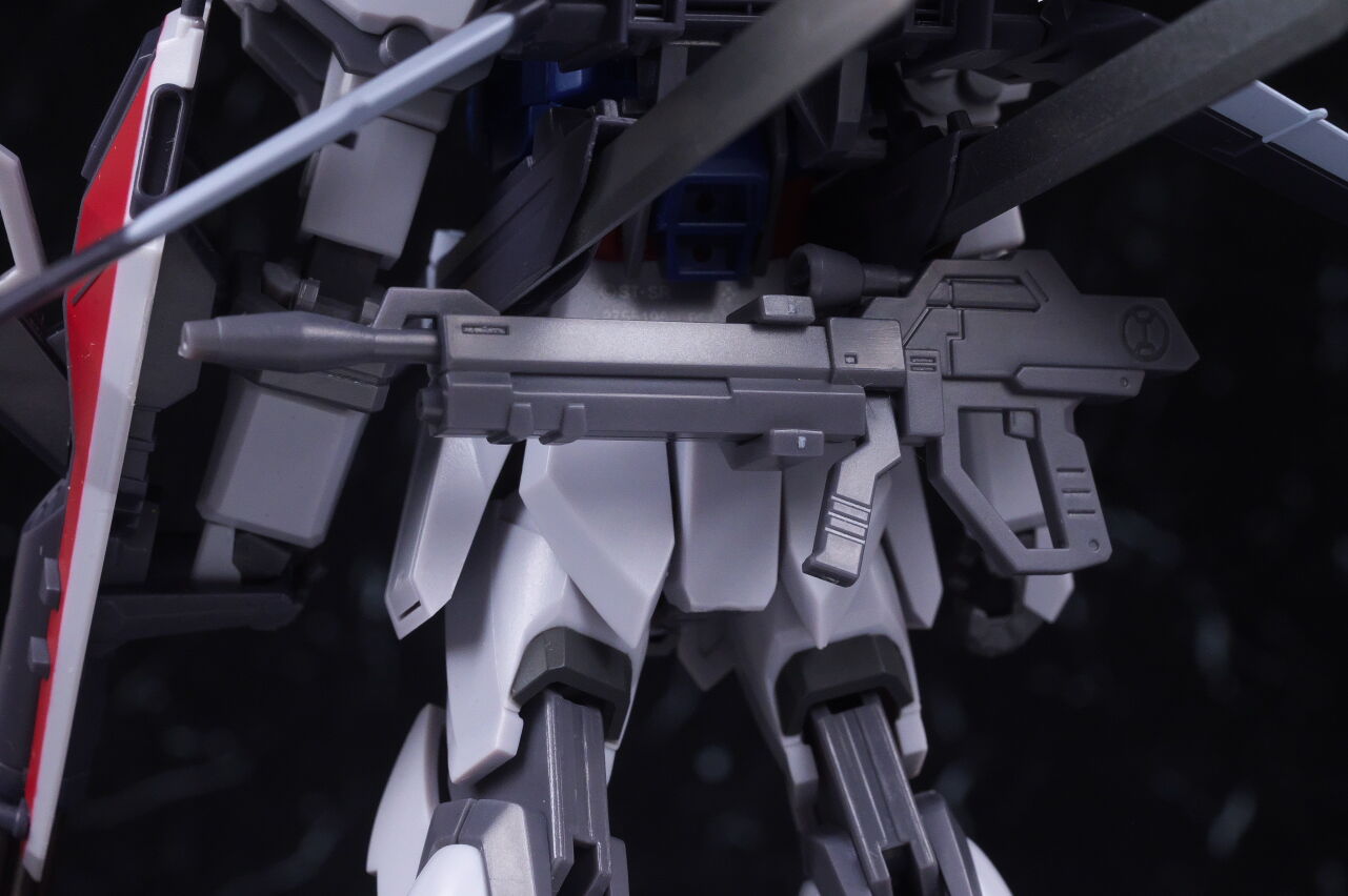 ストライク本体については設定に準じてカラーリングが暗くなり、左肩にマーキングが追加されただけで、造形に関しては同じなので、可動など基本的な出来はノーマルと変わらず。