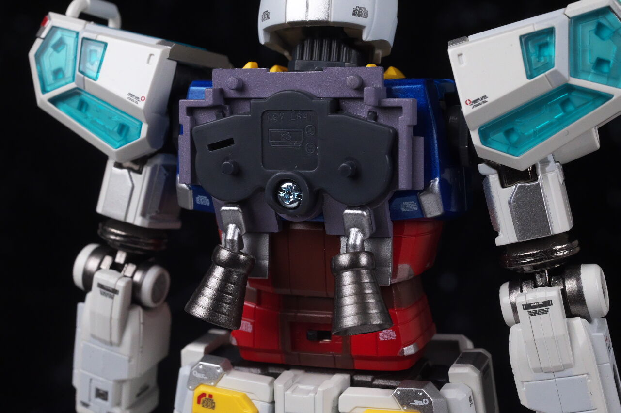RX-78F00の発光ギミックがそのまま流用されており、バックパックのカバーを取り外すと、内部には発光ギミック用の電池を入れるパーツが。腰裏にはスイッチ。