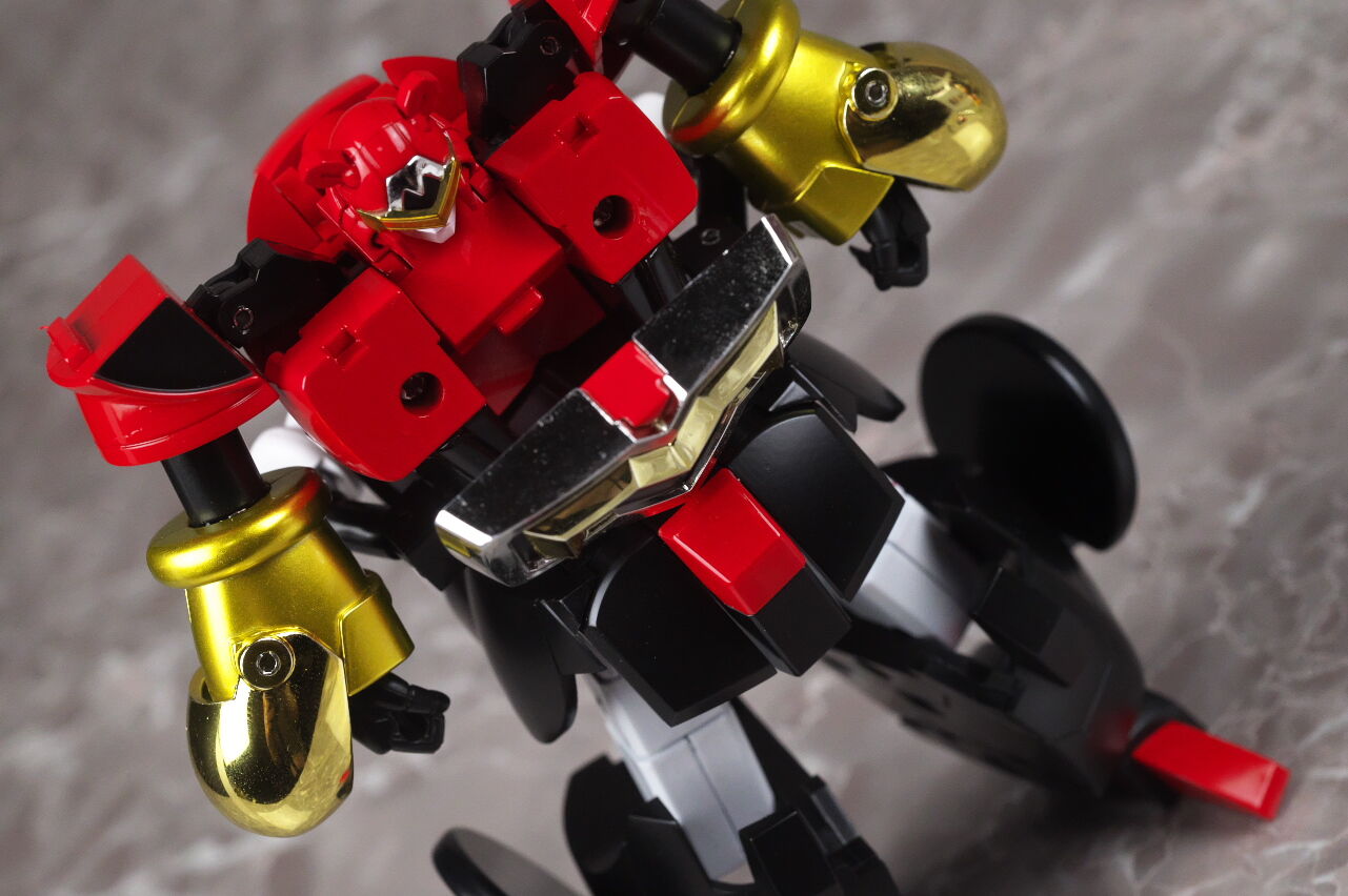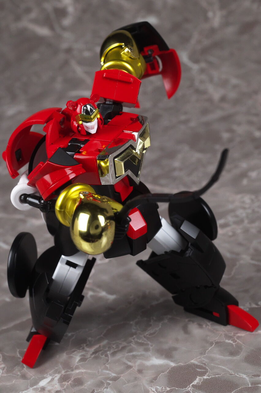 頭の位置を整え、胸部を閉じたらリアルロボット形態完成。尻尾は武器として、腹部パーツは盾として装備。