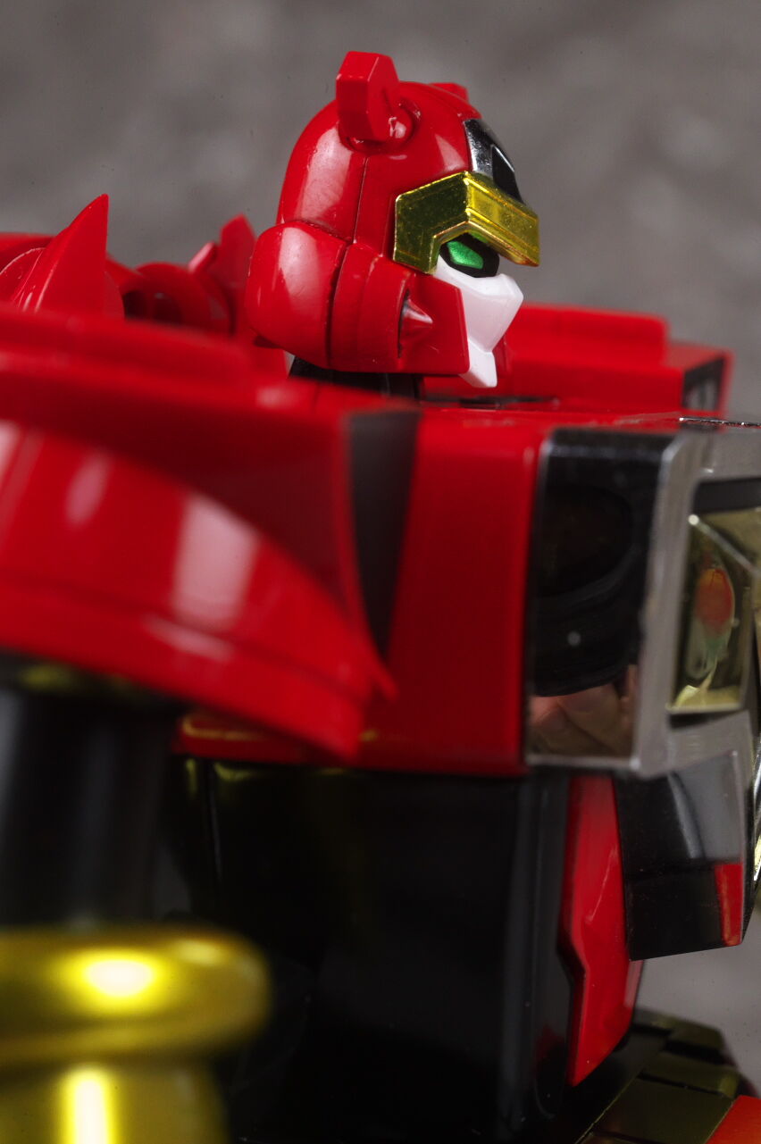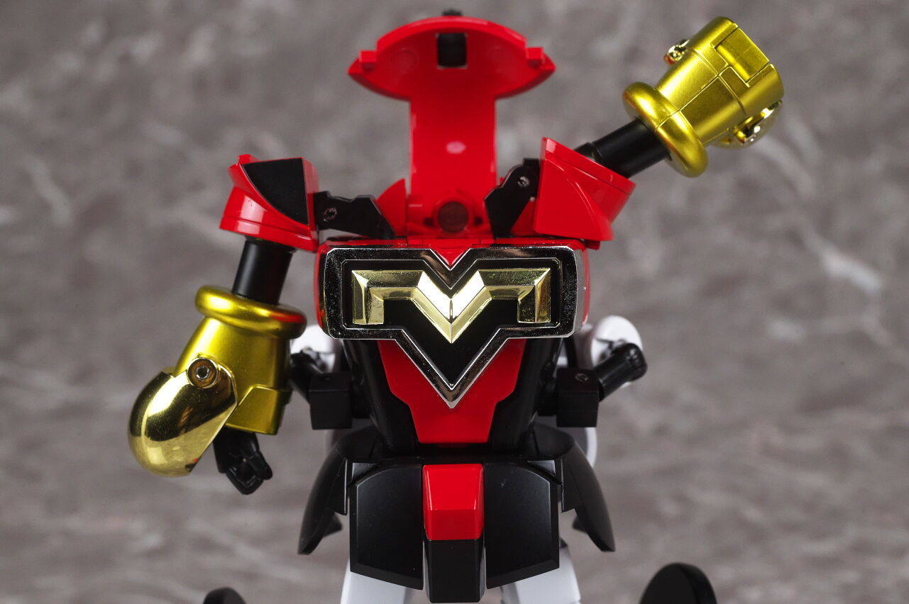 一旦胸部アーマーを開いて内部のロボット形態頭部を展開。
