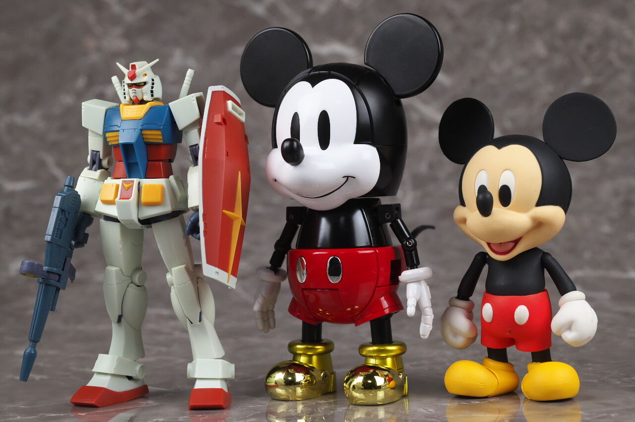 ミッキー形態でロボット魂ガンダムやねんどろいどミッキーと。普通のミッキーと並べると、こちらの形態も結構ロボット感がある感じでした。