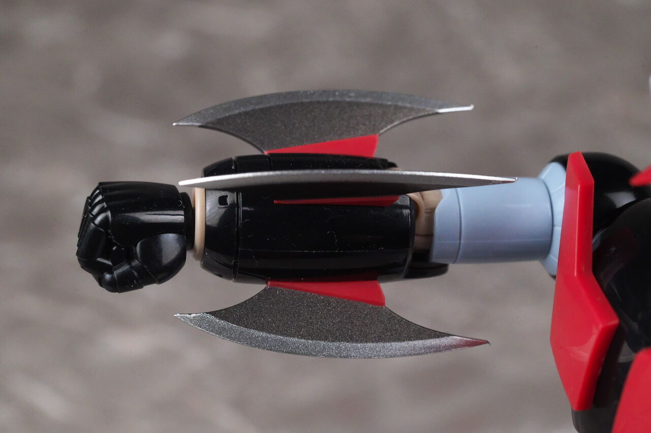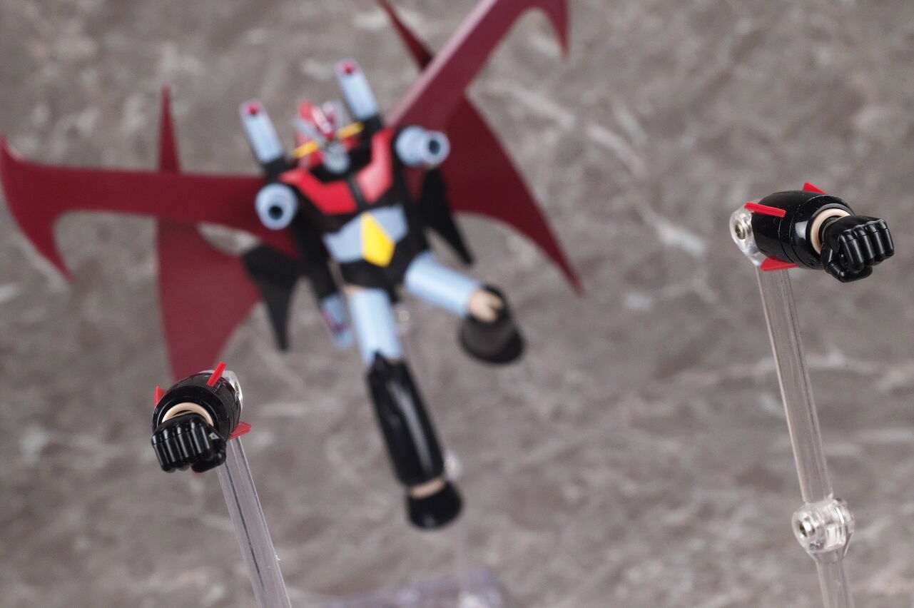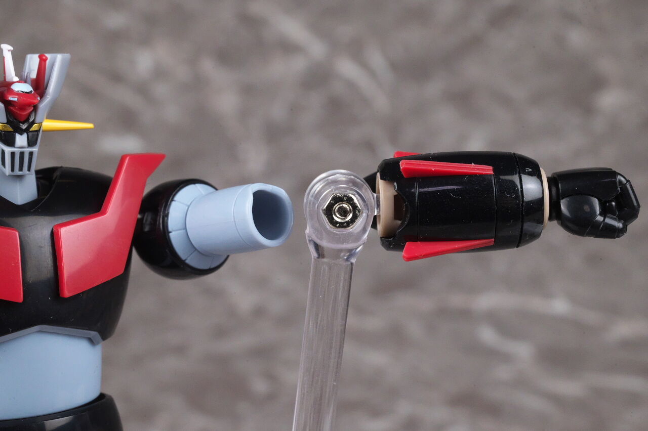 ロケットパンチは一旦肘から先を抜き、内部の関節パーツを取り外し、腕側にジョイントを付けて再現。ジョイントには魂ステージが使用可能。