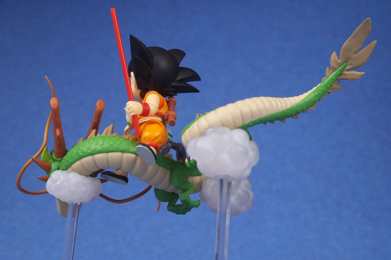 悟空は完全新規造形で、プロポーションや顔、道着の色まで表紙イラストを忠実に再現した作りになっており、可動なども問題なく出来は良好、龍の方もイラストを完全再現した造形塗装で、また台座支柱のマグネットでの固定ギミックも面白く、ジョイントのおかげで悟空もしっかり固定出来、バラバラでもイラスト通り組み合わせても文句無しの完成度の高い仕上がりでした。