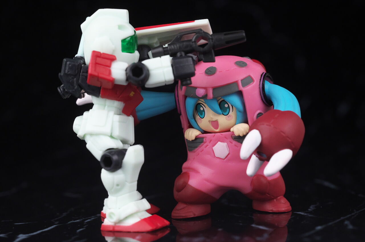 「45周年ガンダム×初音ミク スペシャルコラボ」プロジェクトが展開中ということで、最近色々ガンダムと初音ミクのコラボ商品が出てますが、今回はアイドル戦士MV内のデフォルメキャラをフィギュア化したガシャポンが発売。