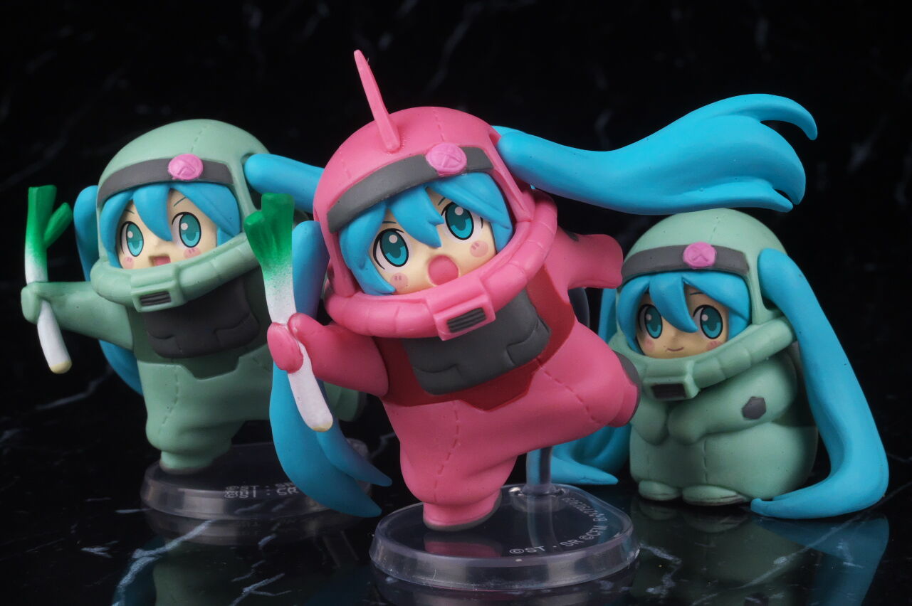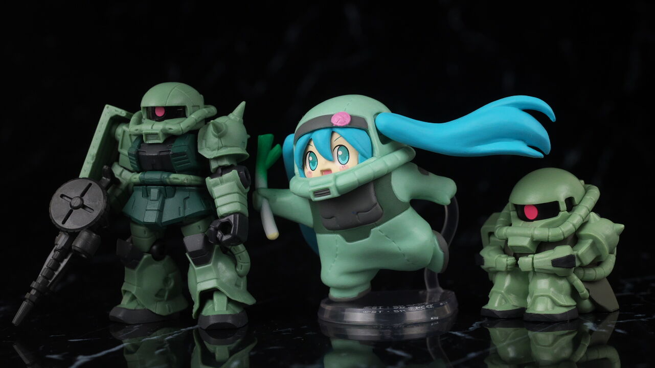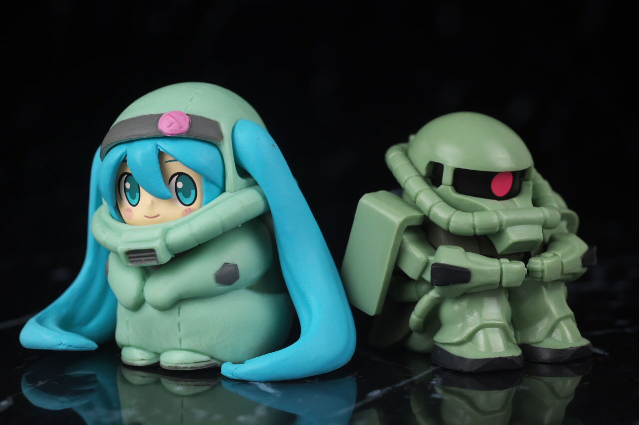 ガンダムと言いつつ今回のフィギュアはザクとズゴックのみですが、デフォルメの初音ミクがMSの着ぐるみを着ているというコンセプトが面白く、またポージングや表情などのデザインも可愛くて、フィギュア自体の造形塗装の精度も高く、かなり満足度の高い出来に仕上がってました。