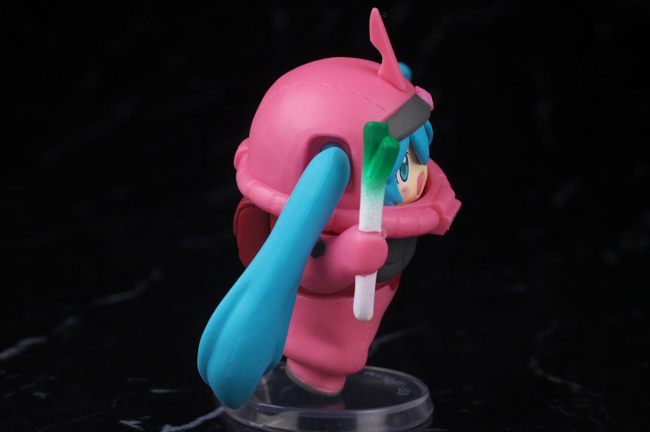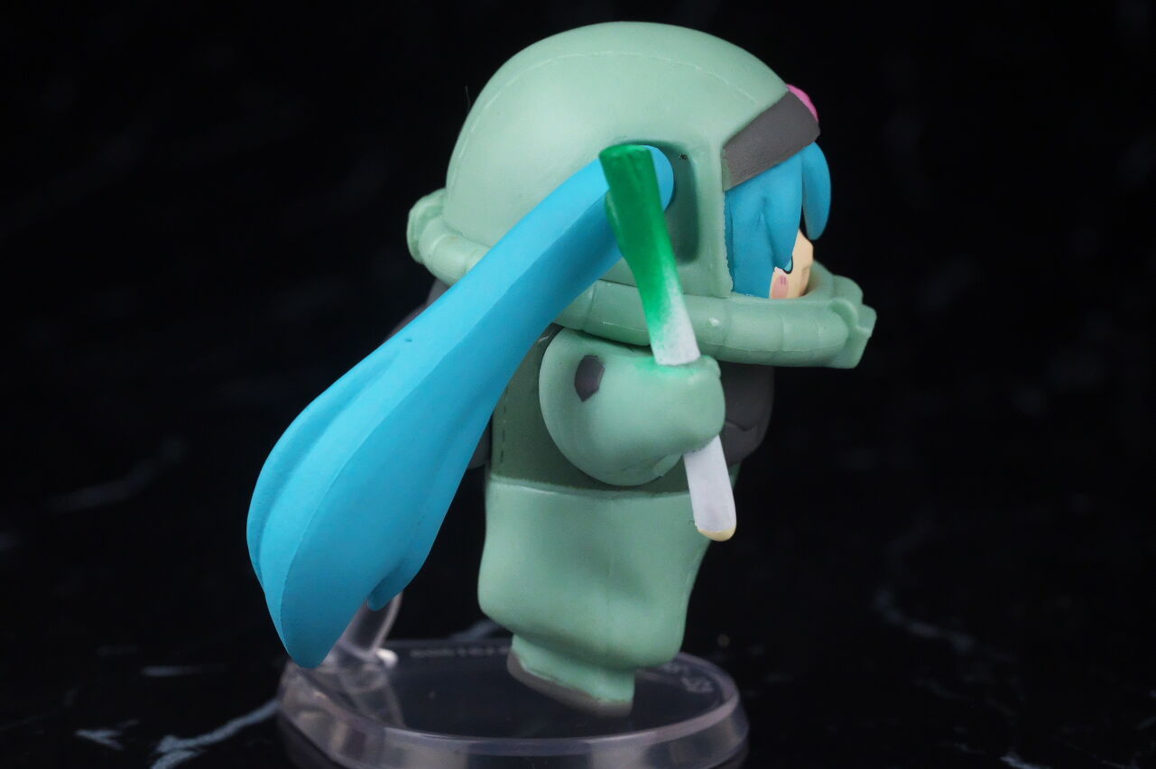 造形の大半は同じネギ持ち緑ザクと共通で、こちらは指揮官機アンテナが付き、顔を出してる部分のミクが別造形になってました。