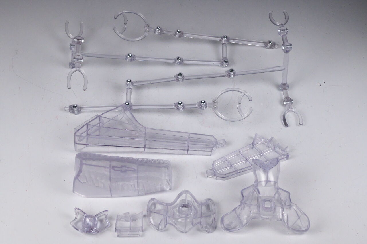 正面。一応自立は可能ですが、重量で不安定だったり、接地部が傷まないようにする配慮か台座が付属。通常形態時は台座にクリアパーツのサポートを付けて固定する方式に。
