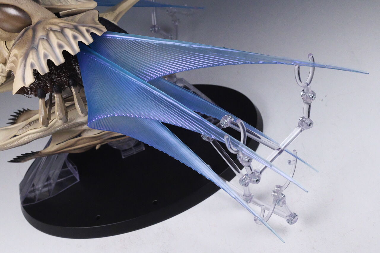 翅はクリアパーツの上から塗装されており美しい仕上がり。補助台座も付属しますが、使わなくても角度維持は十分可能でした。