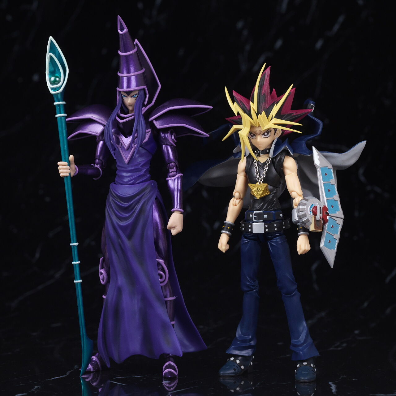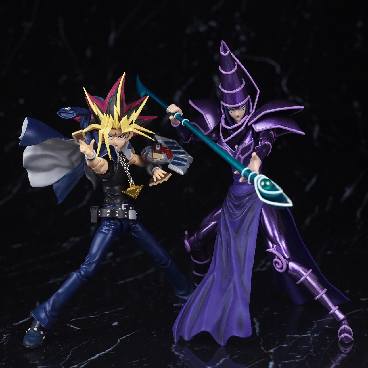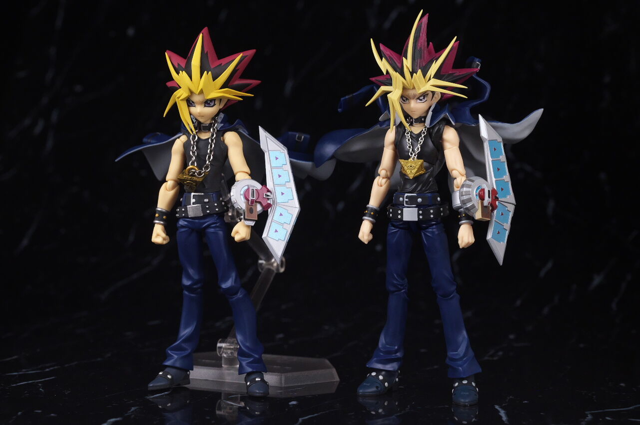 figma版の闇遊戯と。学ランマントが外れやすいという難点はあるものの、顔の再現度などはやはり後発のこちらの方が良かったです。