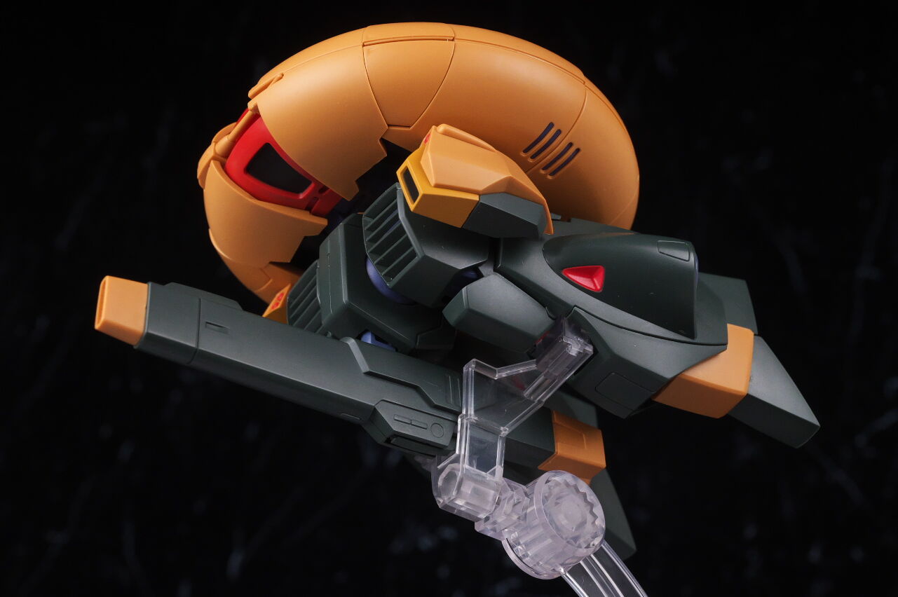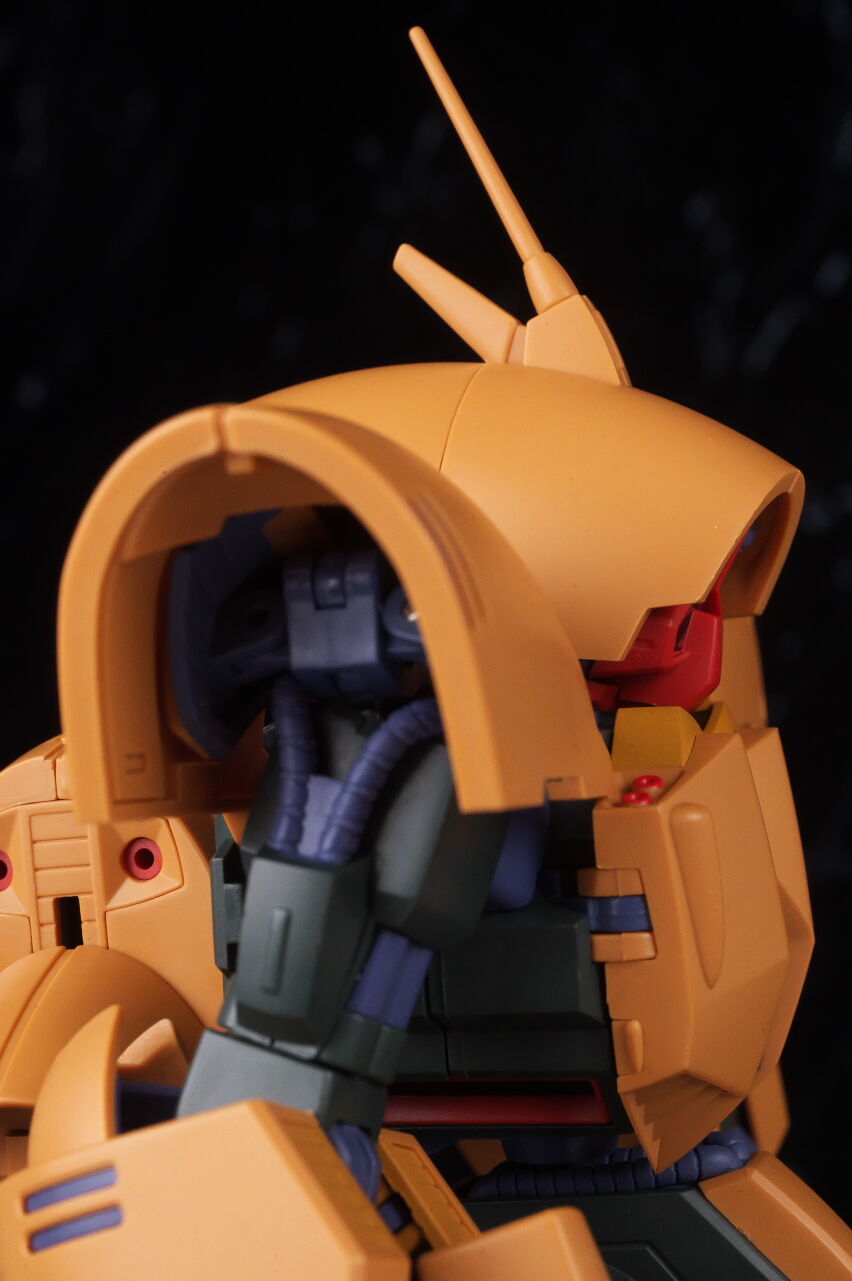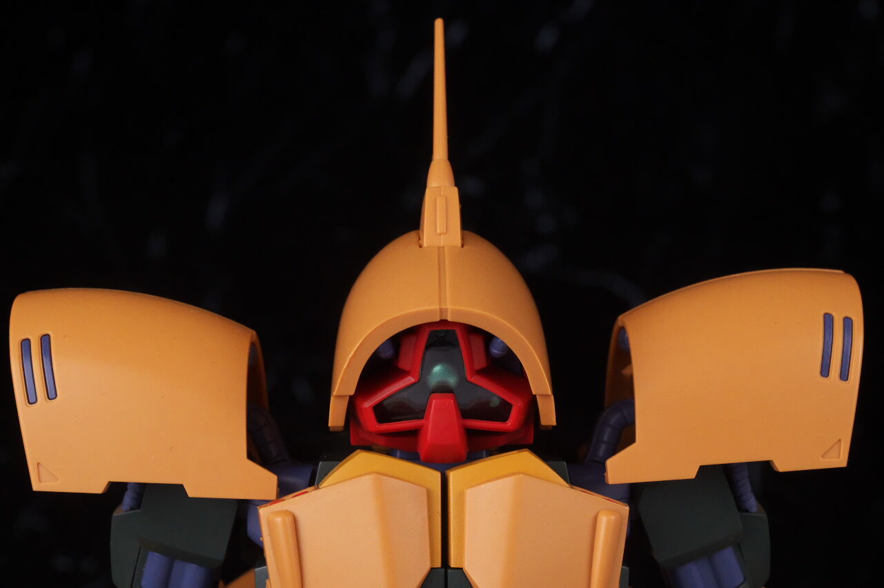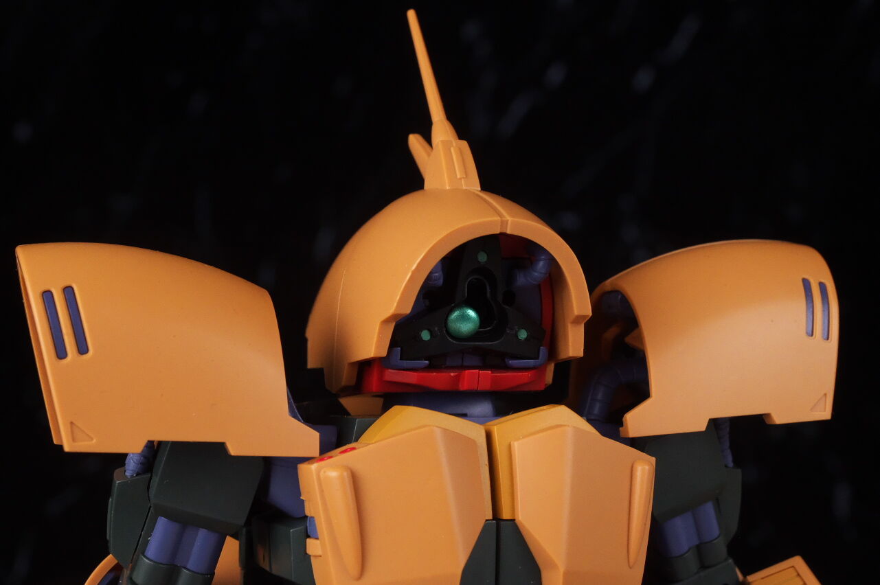 顔。ドムに少し似たモノアイ周りや曲線的なシルエットなど劇中通りの造形。内側のパイプやクリアパーツのモノアイカバー内部などのディテールも精密に造形。