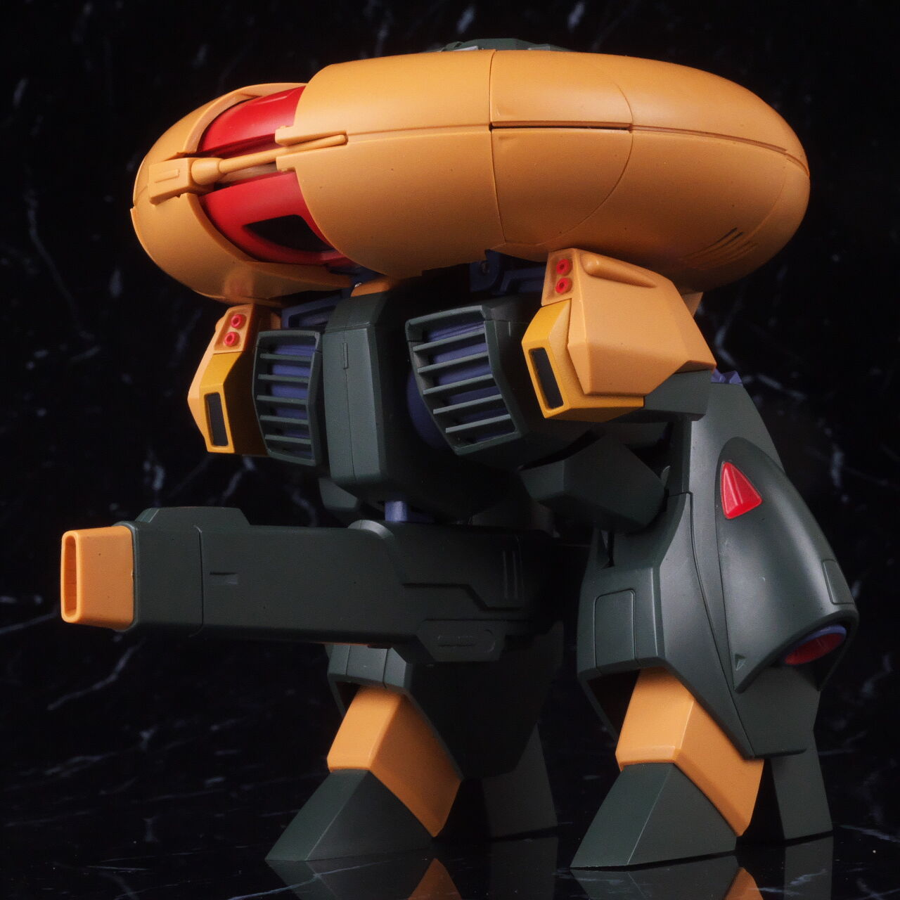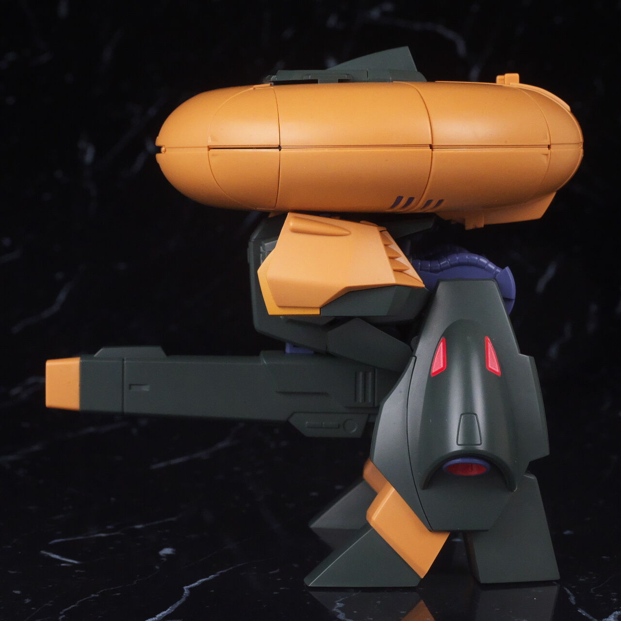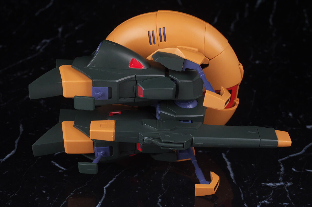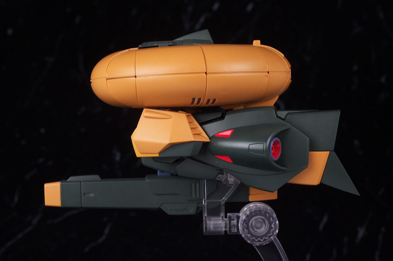 横から。円盤の下に足が付いているような見た目で、厚みはそこそこあり。大型ビームライフルは股間の部分に差し込んで固定。
