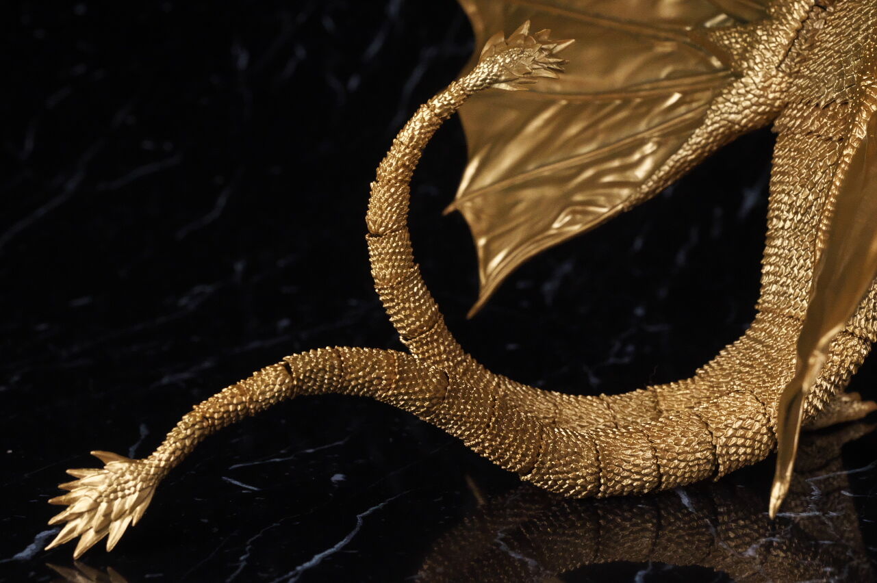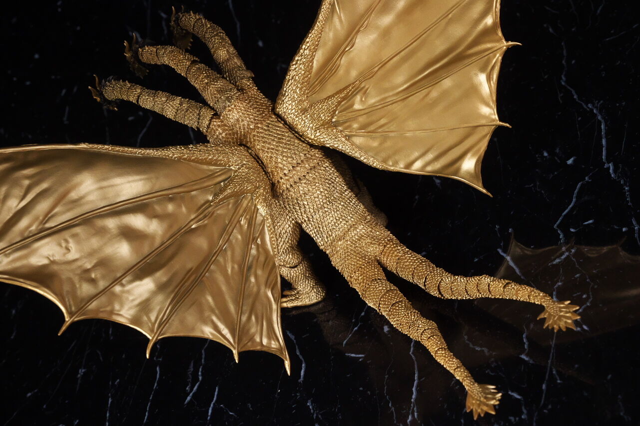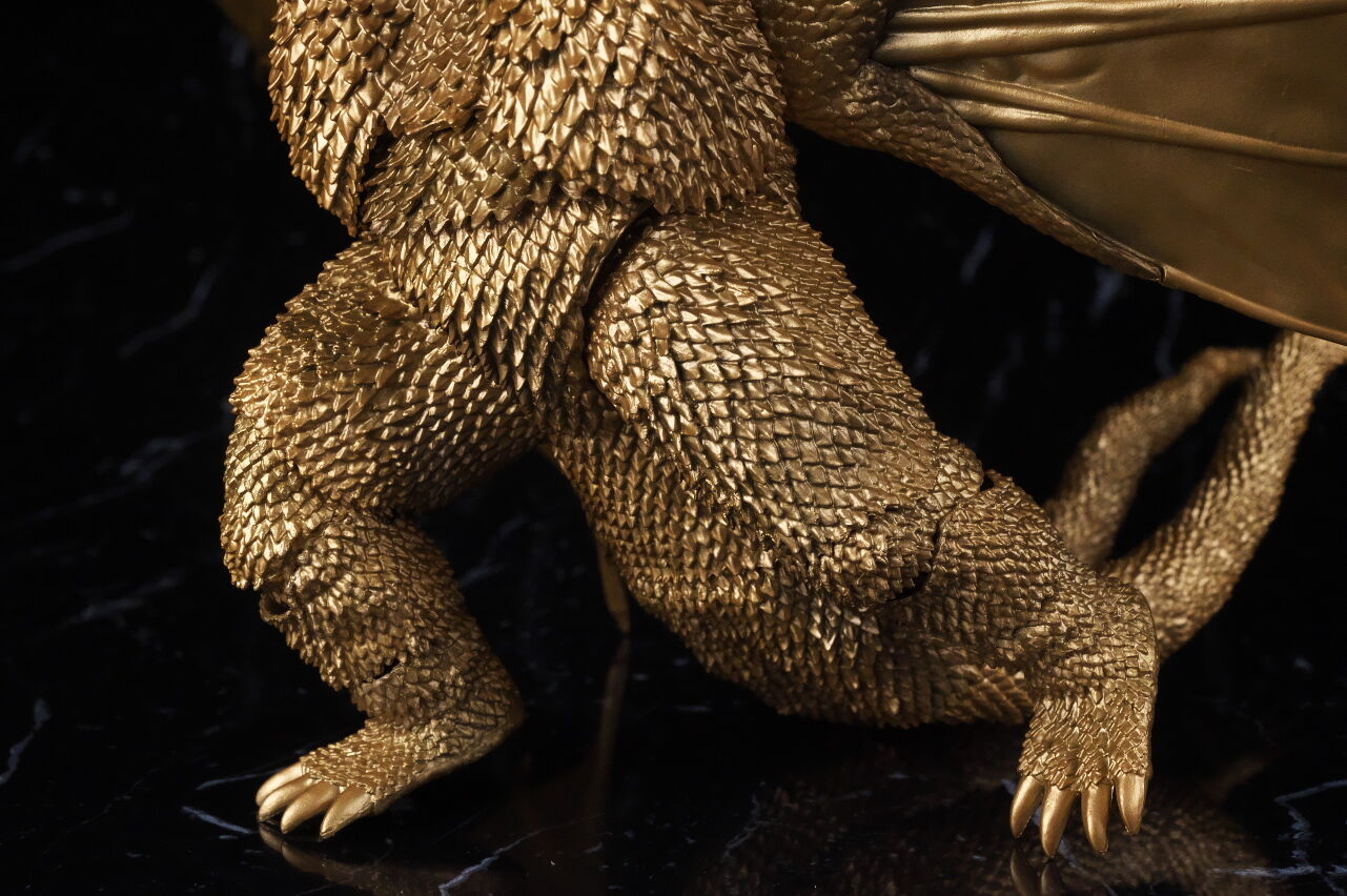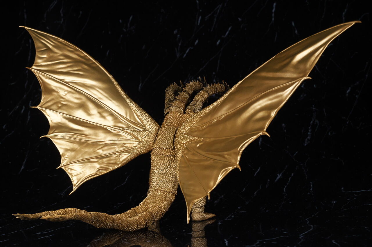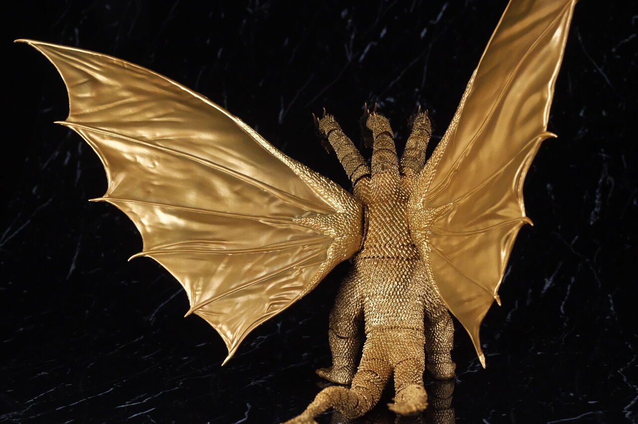 個体差か右の翼の上下の固定が出来ず、常に下がった状態にしかならない点だけ残念でしたが、新規なだけあって造形はかなり良く、1972年時のちょっと愛嬌のある顔や、幅50㎝近くにもなる大きな翼、シャープな鱗など造形は手が込んでいて、全身の金色も色味などイメージ通りかつ塗装も丁寧で、迫力ある見た目に仕上がってました。