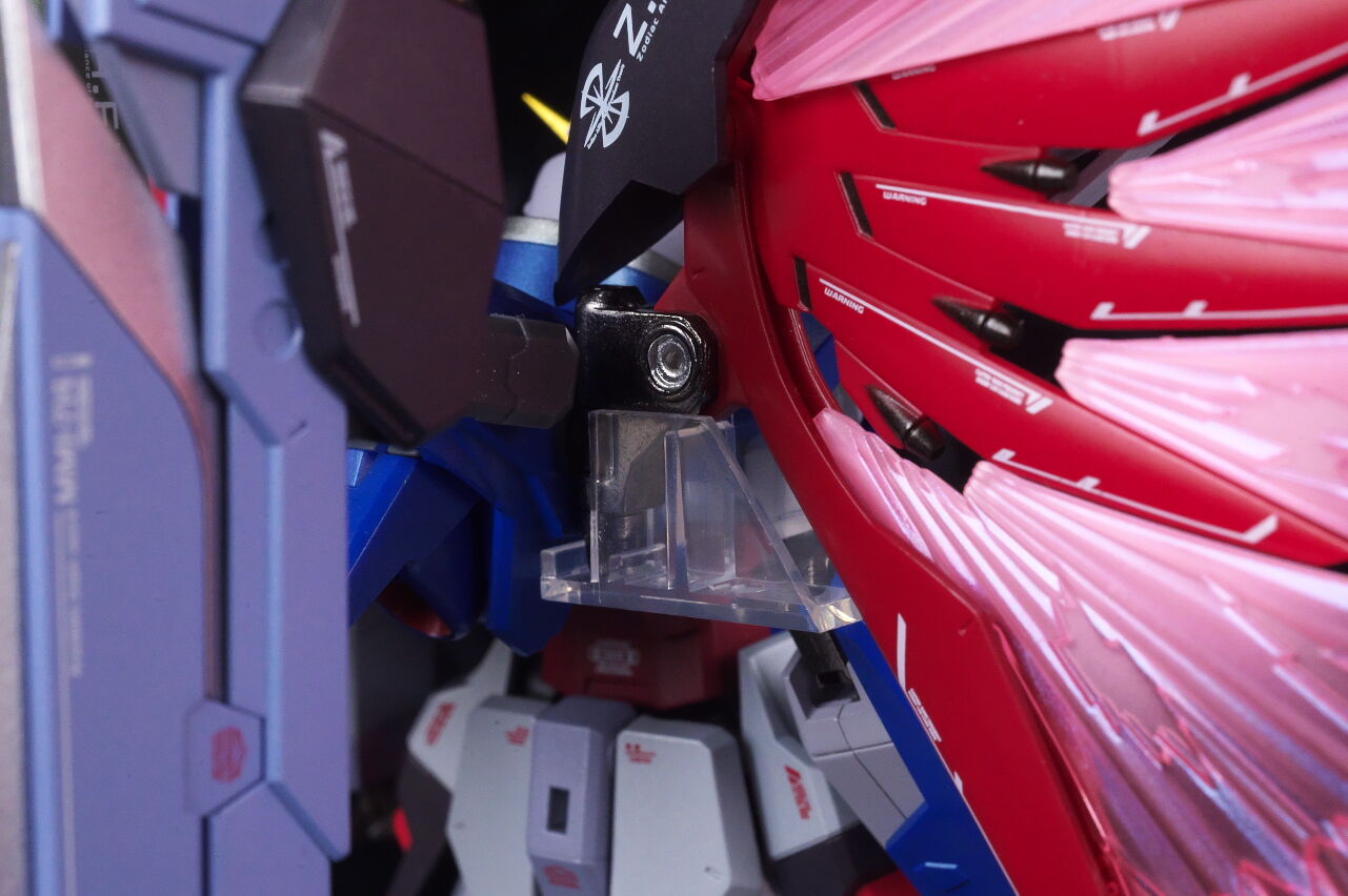 なお本体接続部のピンは前後に動かすことが可能で、ロック機構もあり。後ろ側や支柱根元に今回必要ないピンが付いてますが、この支柱はストフリの光に翼にも付くそうで、そちらでドラグーン用として使うようでした。