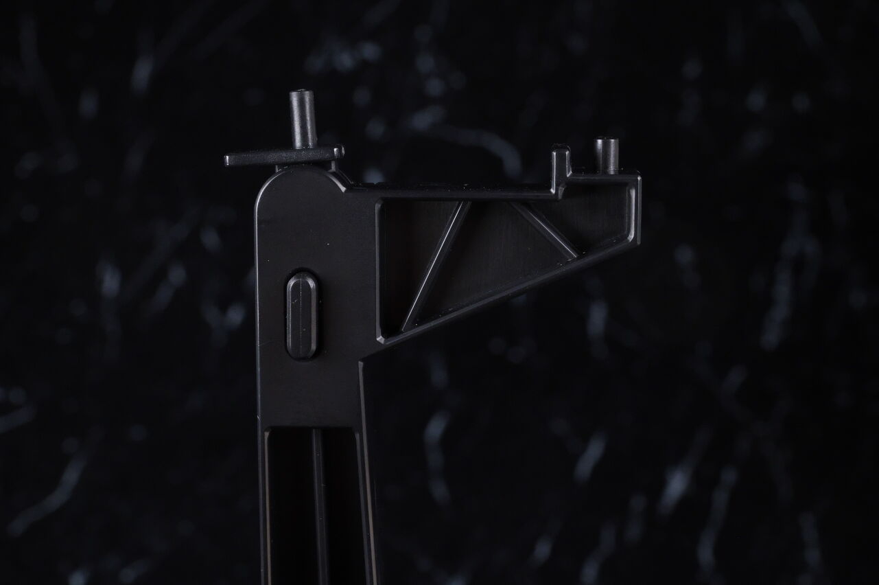 今回付属する新しい支柱を使った状態。こちらは本体付属の通常支柱よりかなり長め。基部や中央に可動部は無いので安定してますが、位置が高すぎてうっかり落下させてしまった場合の衝撃が心配な印象。