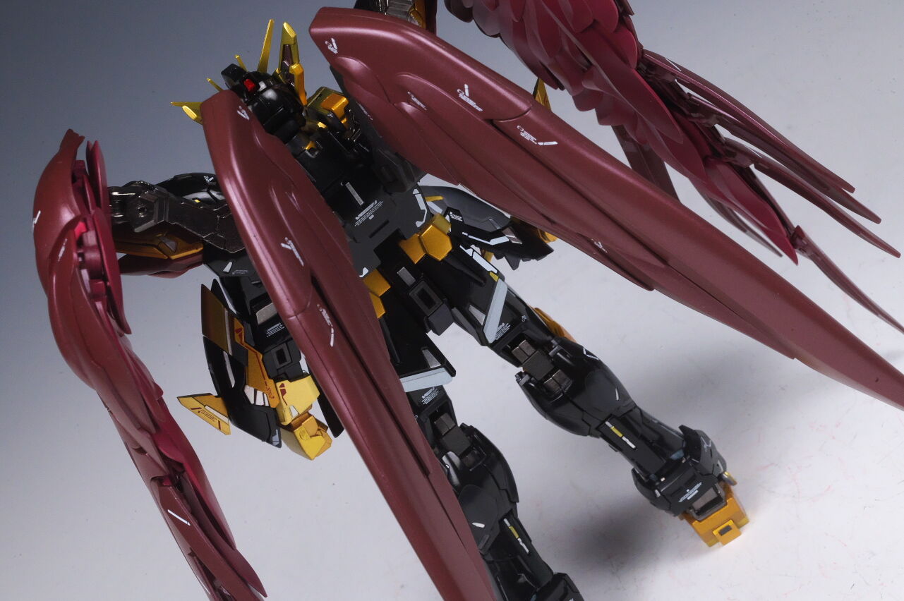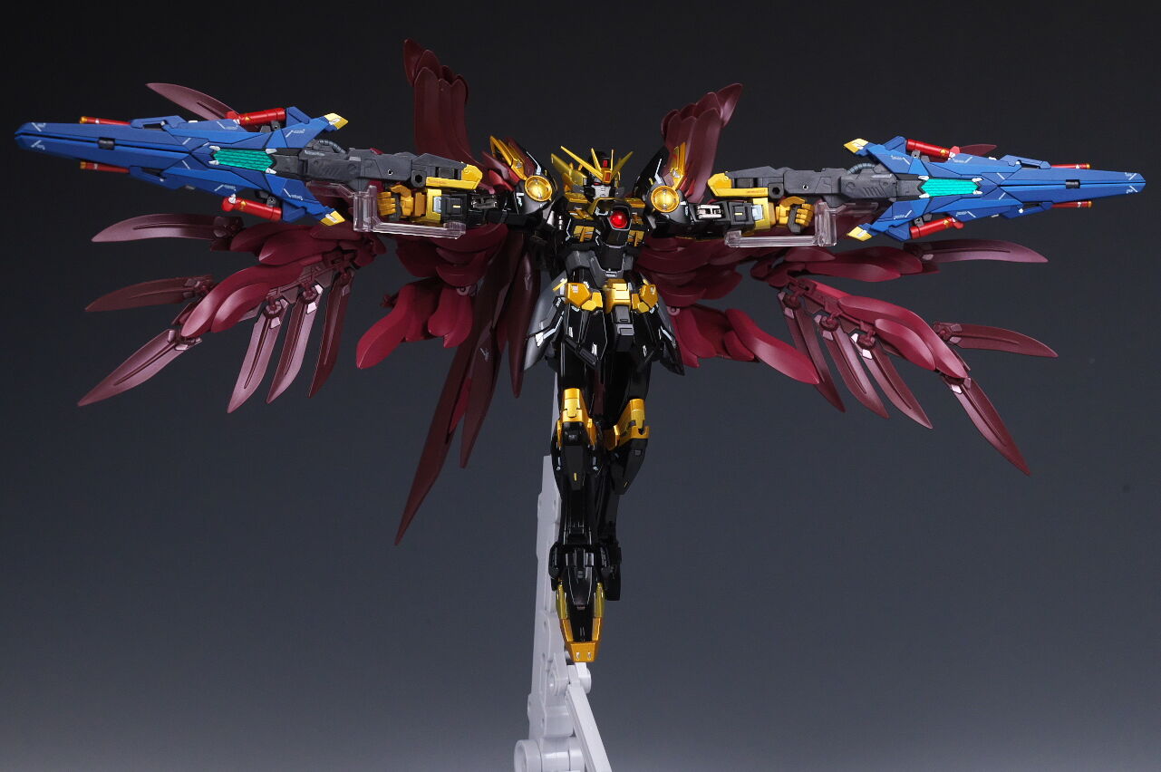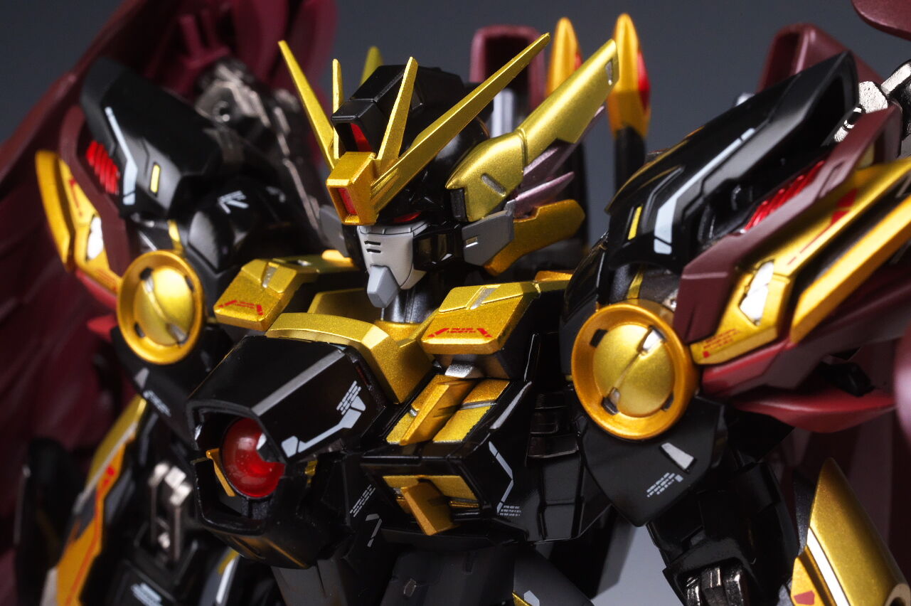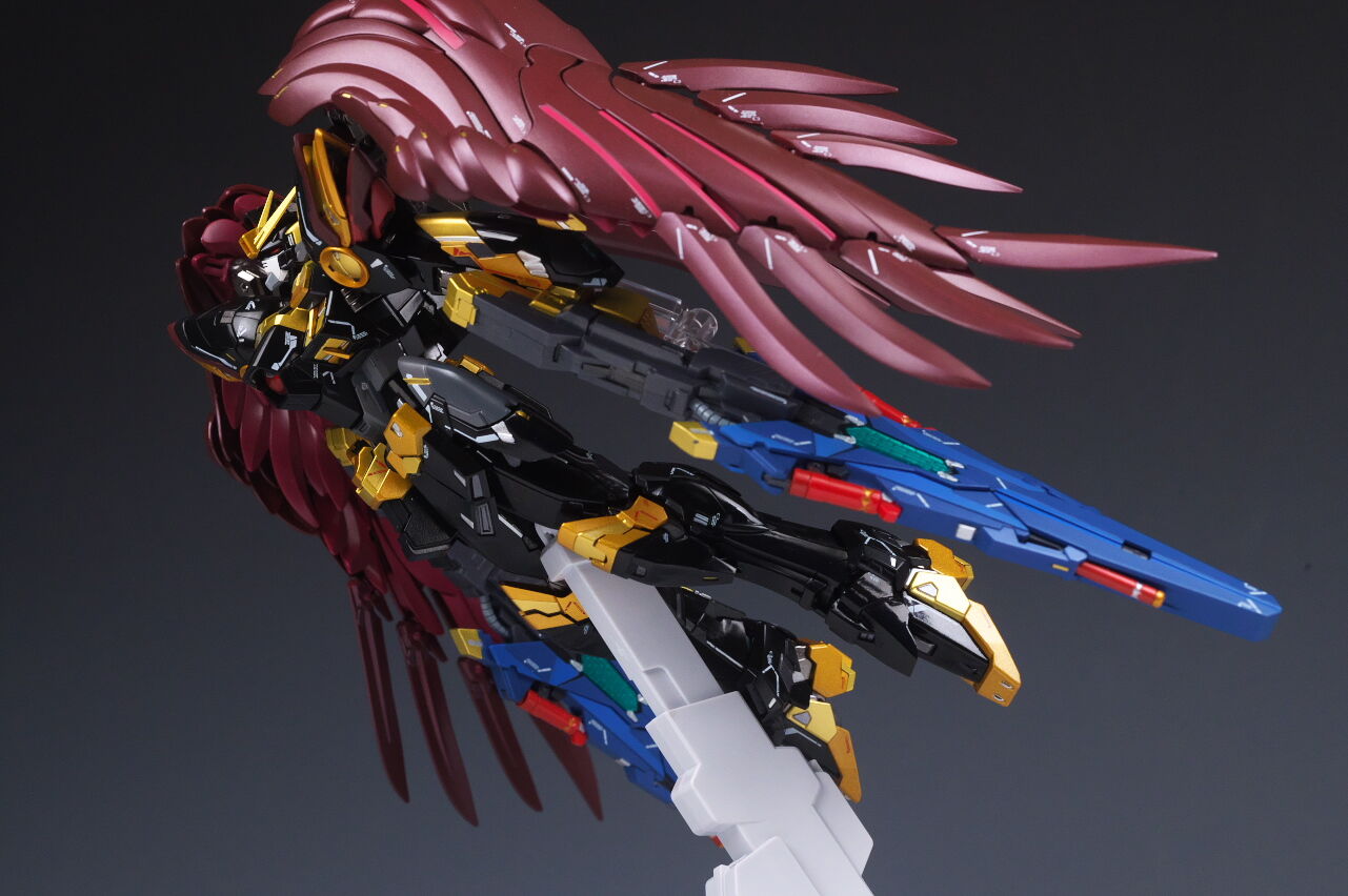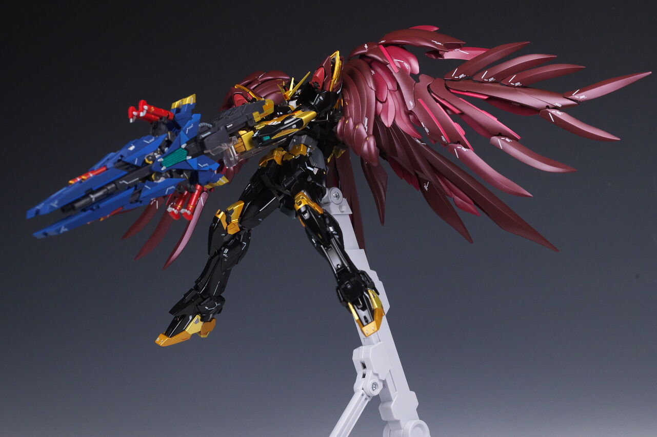 本体造形はノーマルのウイングゼロEWと同じですが、ガウェインをイメージしたという黒金カラーは光沢の強い黒と2色の金で深みのある色と質感に仕上がっており、ゼロのマントイメージのワインレッドのウイングも独特な色味で存在感があり、複数の新武装も造形やギミックなどかなり凝った作りで面白く、想像していたよりも濃く満足度の高い内容になってました。