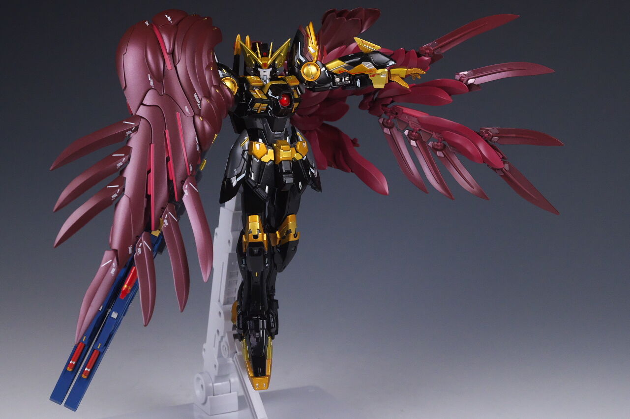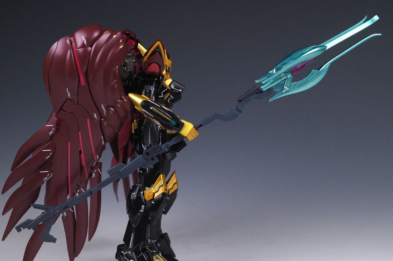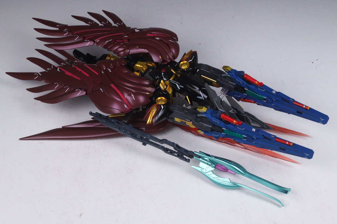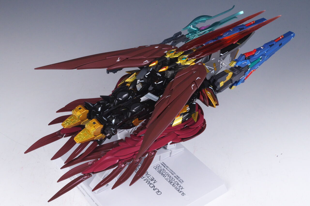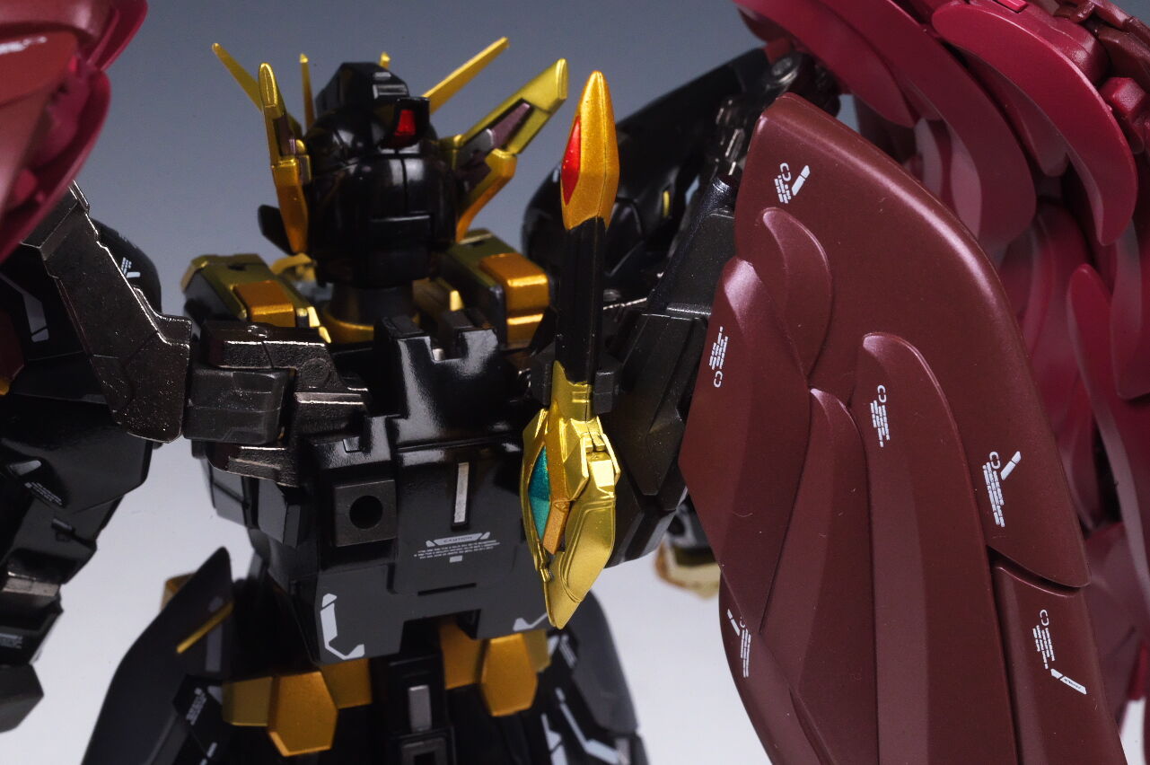 本体造形はノーマルのウイングゼロEWと同じですが、ガウェインをイメージしたという黒金カラーは光沢の強い黒と2色の金で深みのある色と質感に仕上がっており、ゼロのマントイメージのワインレッドのウイングも独特な色味で存在感があり、複数の新武装も造形やギミックなどかなり凝った作りで面白く、想像していたよりも濃く満足度の高い内容になってました。