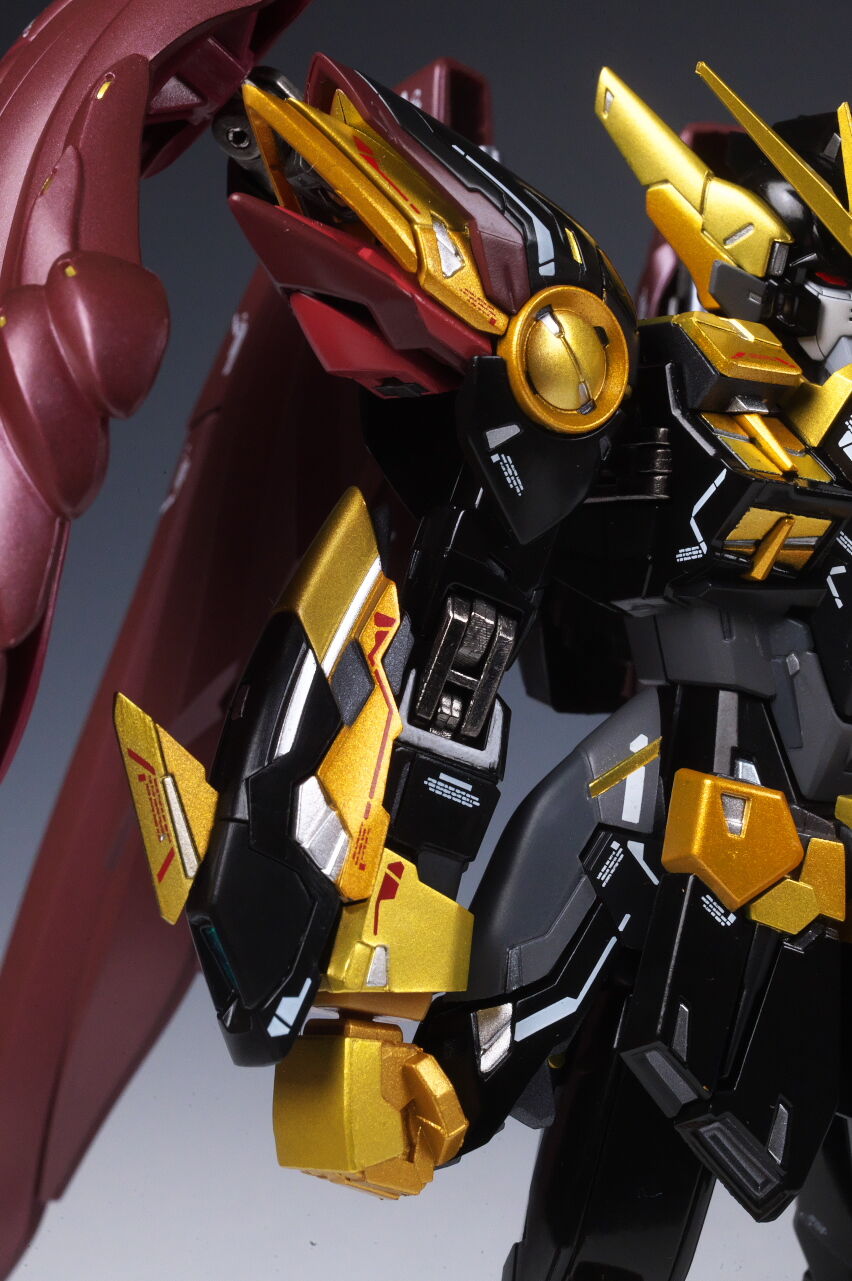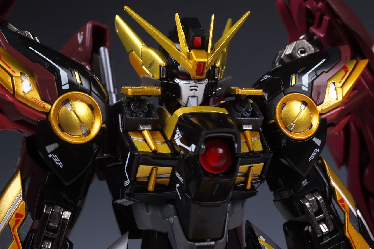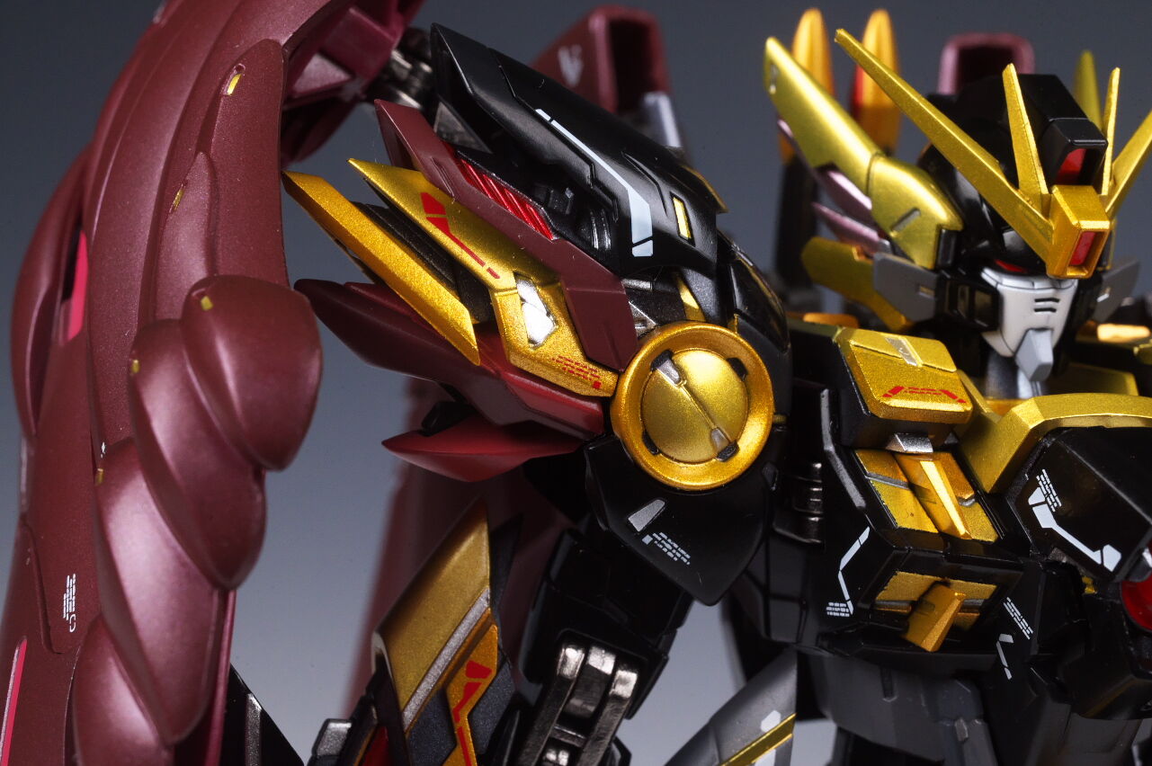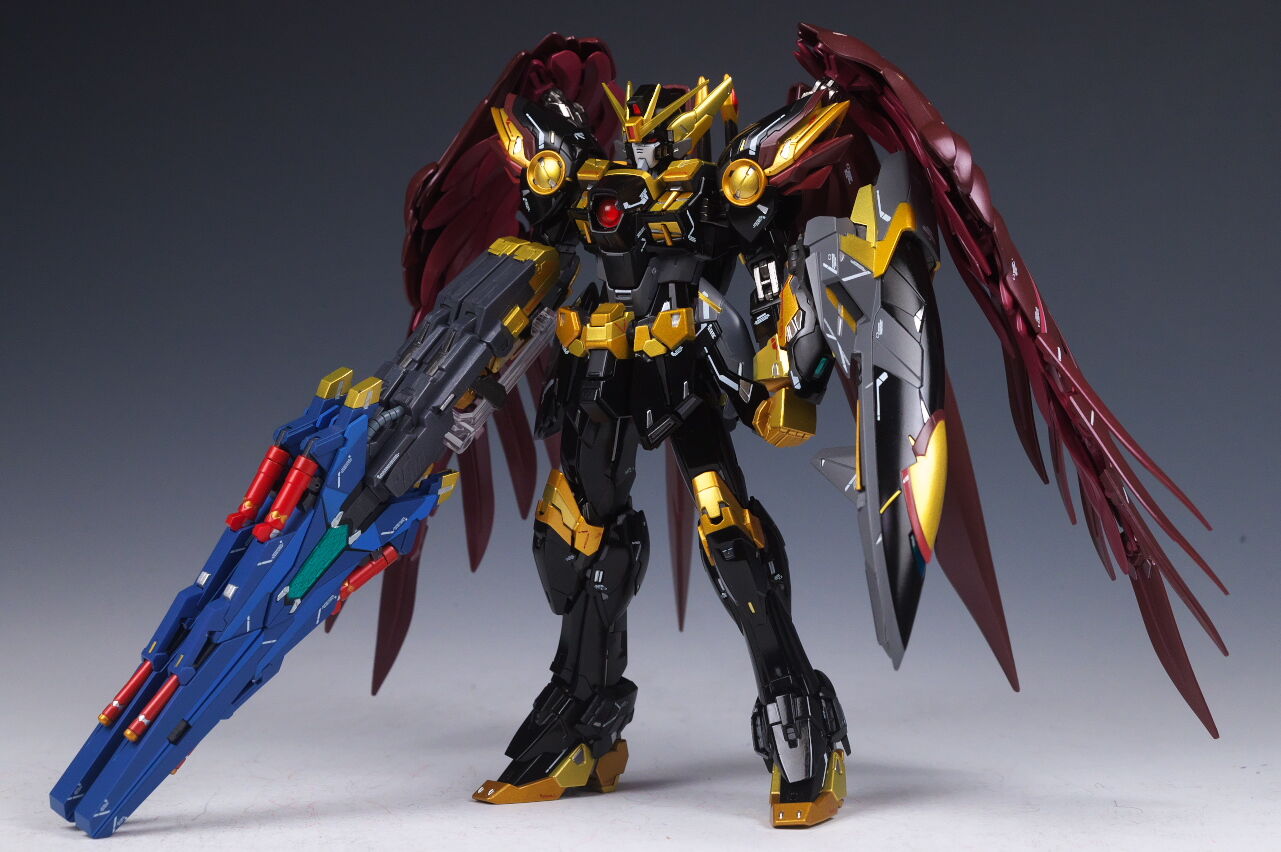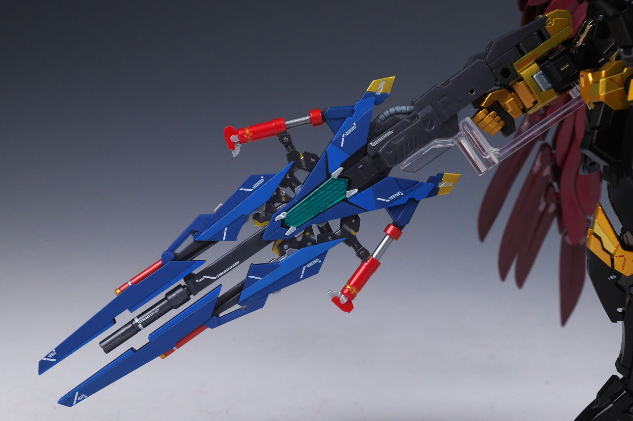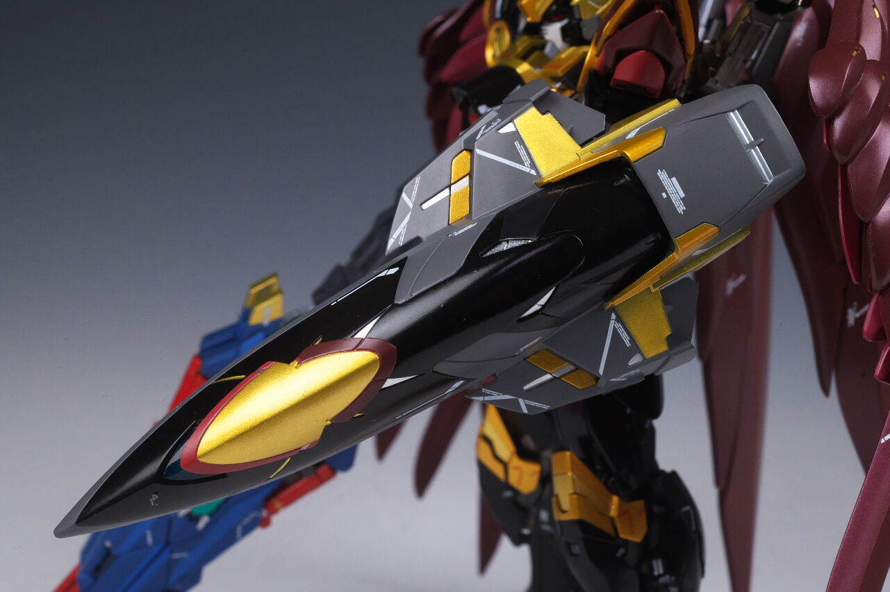 本体造形はノーマルのウイングゼロEWと同じですが、ガウェインをイメージしたという黒金カラーは光沢の強い黒と2色の金で深みのある色と質感に仕上がっており、ゼロのマントイメージのワインレッドのウイングも独特な色味で存在感があり、複数の新武装も造形やギミックなどかなり凝った作りで面白く、想像していたよりも濃く満足度の高い内容になってました。